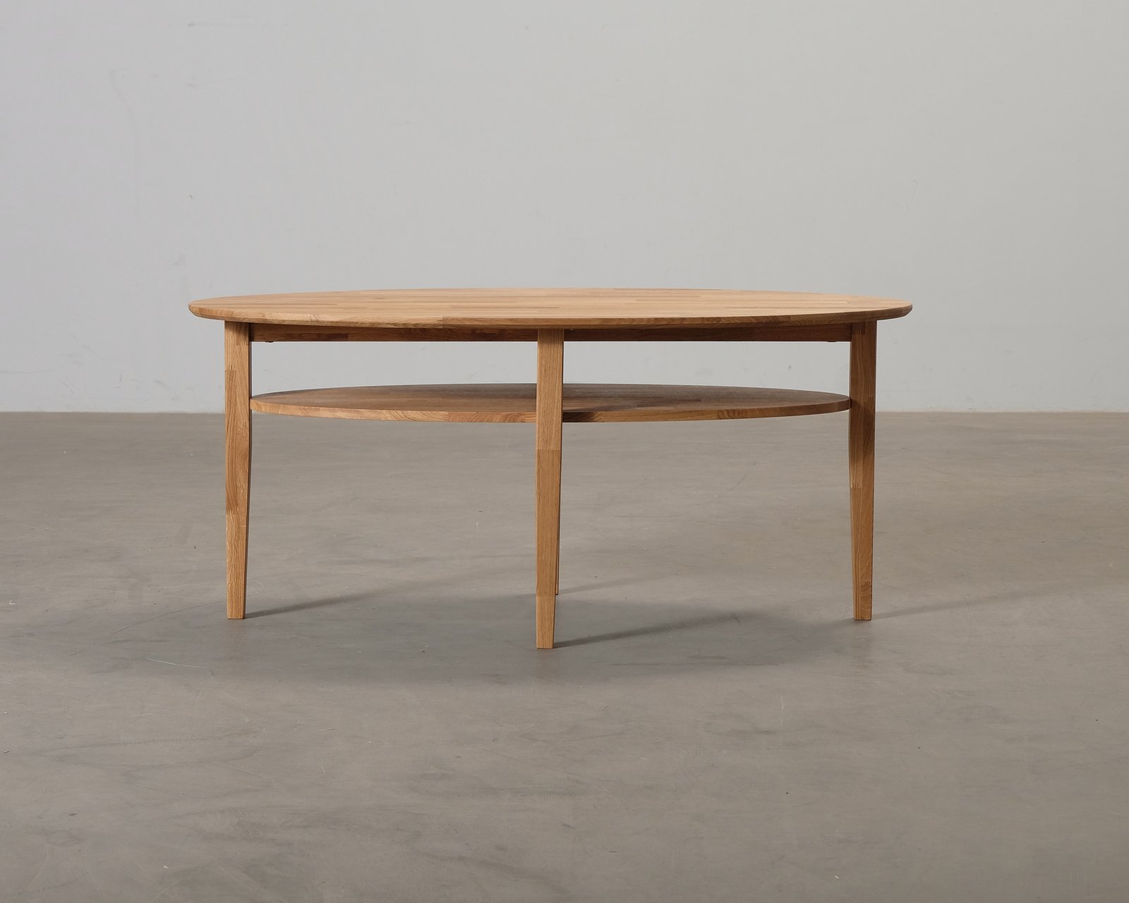 Ett stilfullt och elegant ovalt soffbord i massiv ek. Oanvänd. Bordet är något vingligt i konstruktionen.