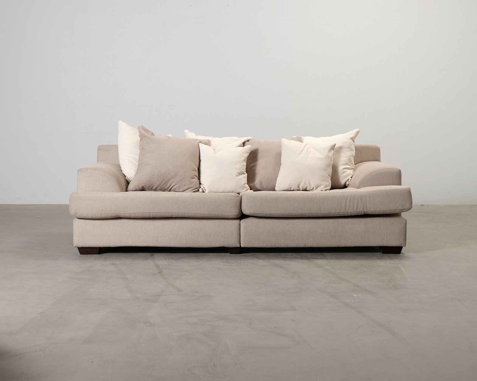 Brun tygsoffa av Furninova. Generösa sittdjupet och stora kuddarna garanterar god sittkomfort. Intryckningar i sittdynorna och några lösa trådar i klädseln. Lätt mörkfärgning i soffans hörn och användningsspår på benen. Helhetsintrycket bra.