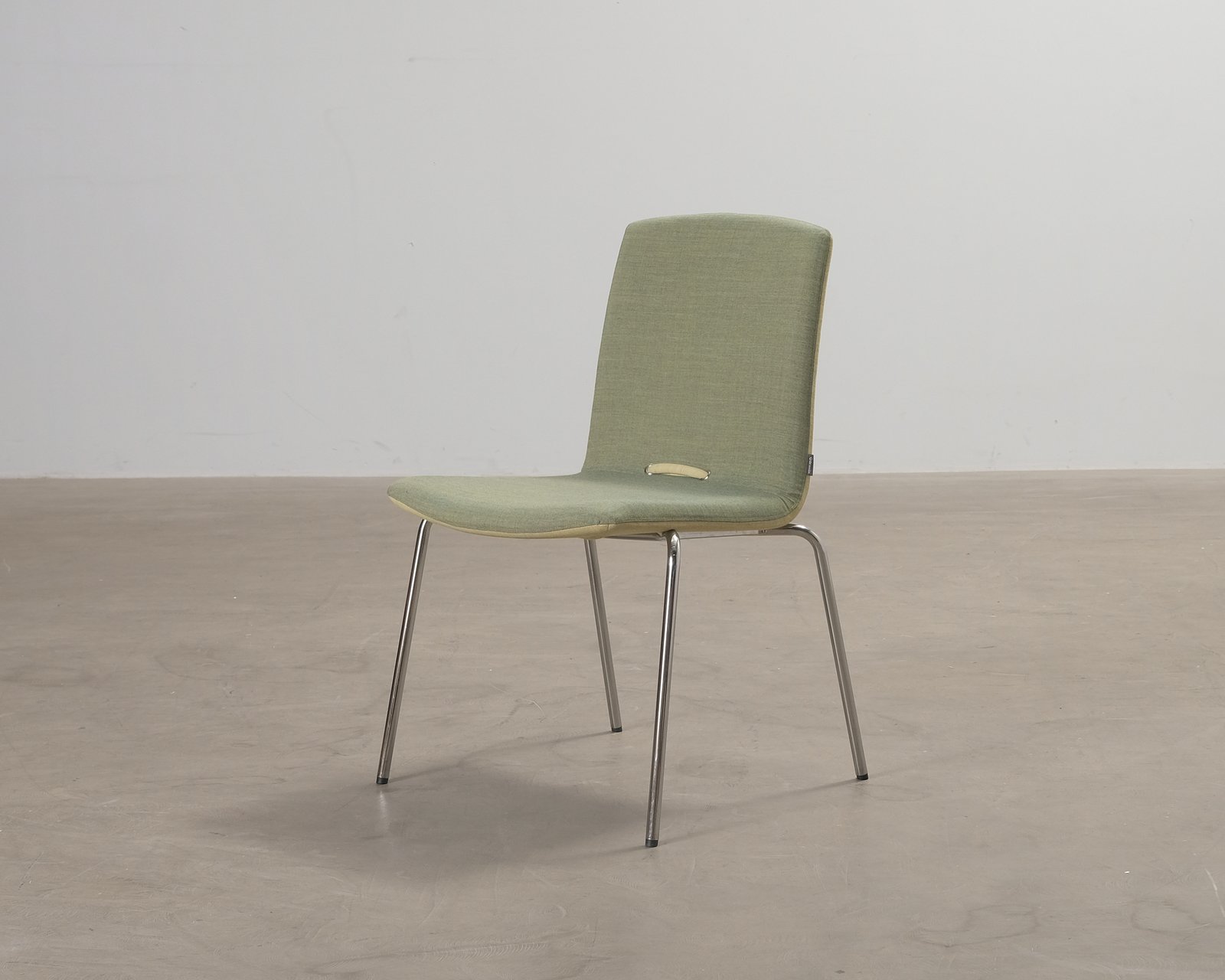 Gärsnäs Day är en stilren och tidlös stol som passar i hemmet, offentliga miljöer och på kontoret. Klädd i grönt tyg. Små spår av användning. Helhetsintrycket är fint.