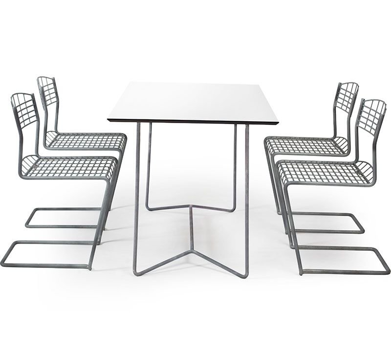 Här visar vi High Tech stolen i galvaniserat stål tillsammans med High Tech bord 70 x 110 cm.
