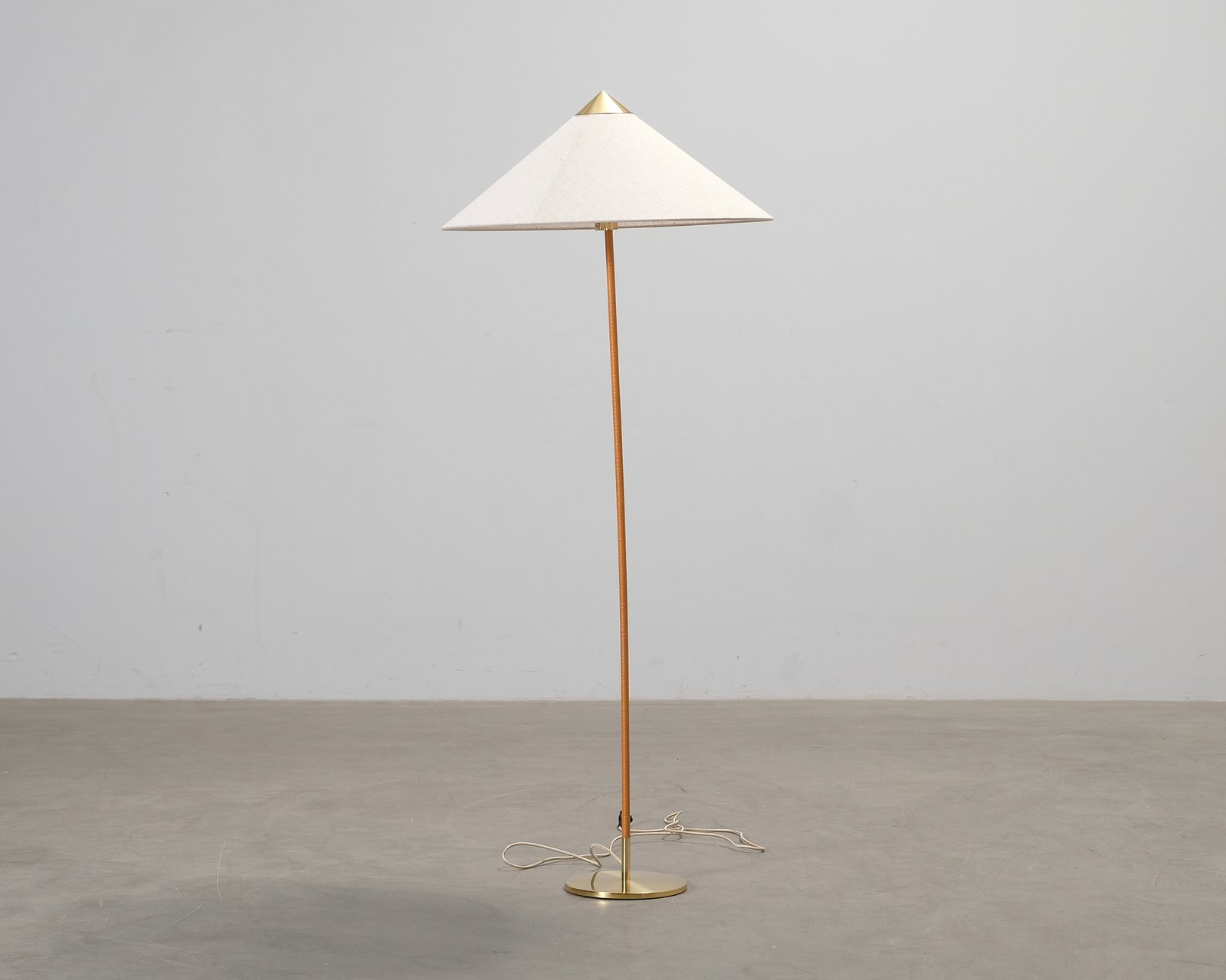 Den eleganta 9602 golvlampan från danska Gubi designades av Paavo Tynell 1935 för Hotel Aulanko. Den har en rottingklädd bas, en elegant lampskärm i canvas och mässingsdetaljer som ger designen en extra dimension. Golvlampan har ett mjukt, behagligt ljus som skapar en mysig atmosfär. Stammen är böjd och det finns bucklor i lampskärmen.
