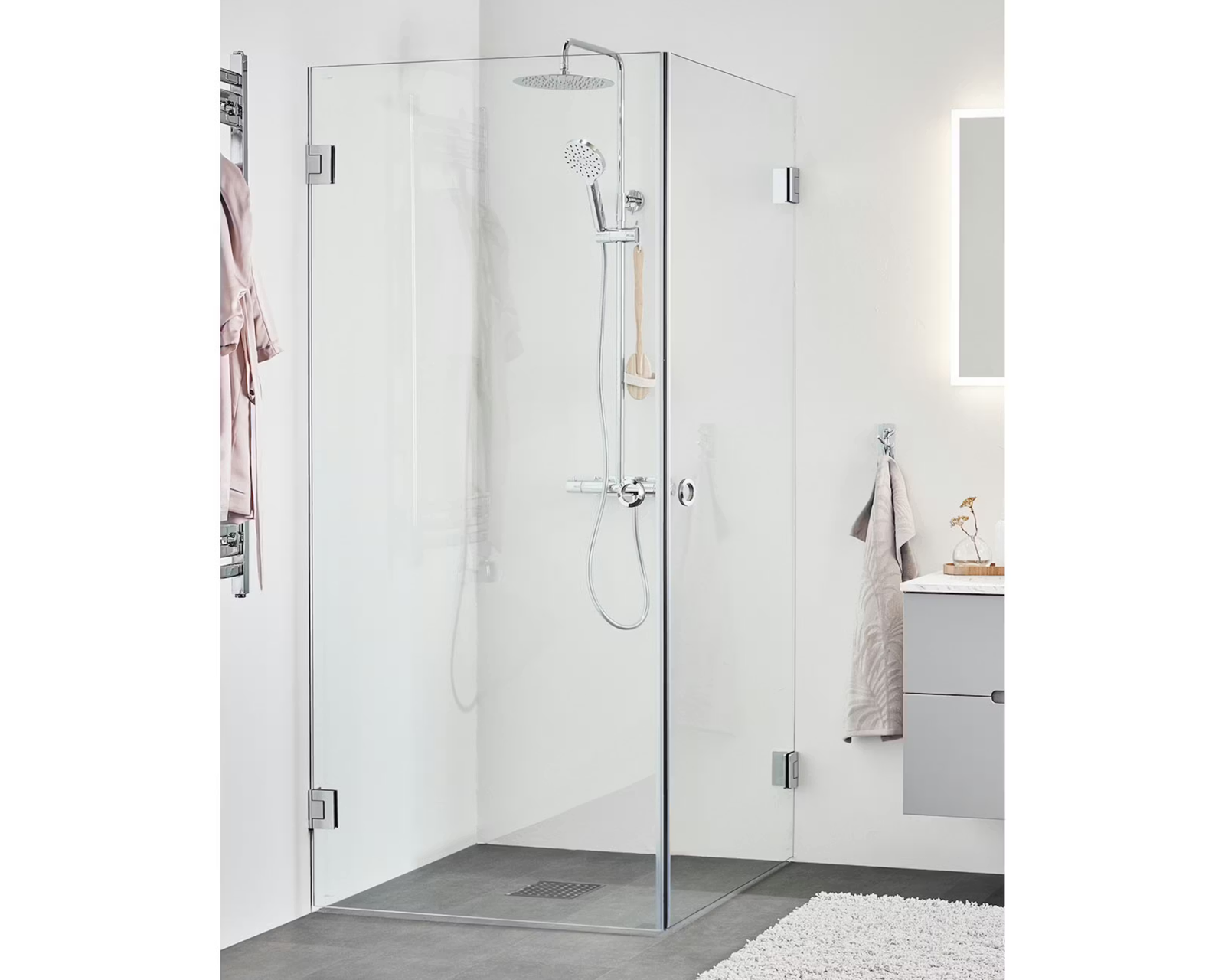 Hafa Infinity är ett exklusivt duschhörn med elegant handtagslösning utan handtag. De stora glasytorna ger ett luftigt intryck och skapar en härlig rymd i badrummet. Observera! Metallkomponenter, såsom handtag och gångjärn, ingår ej.