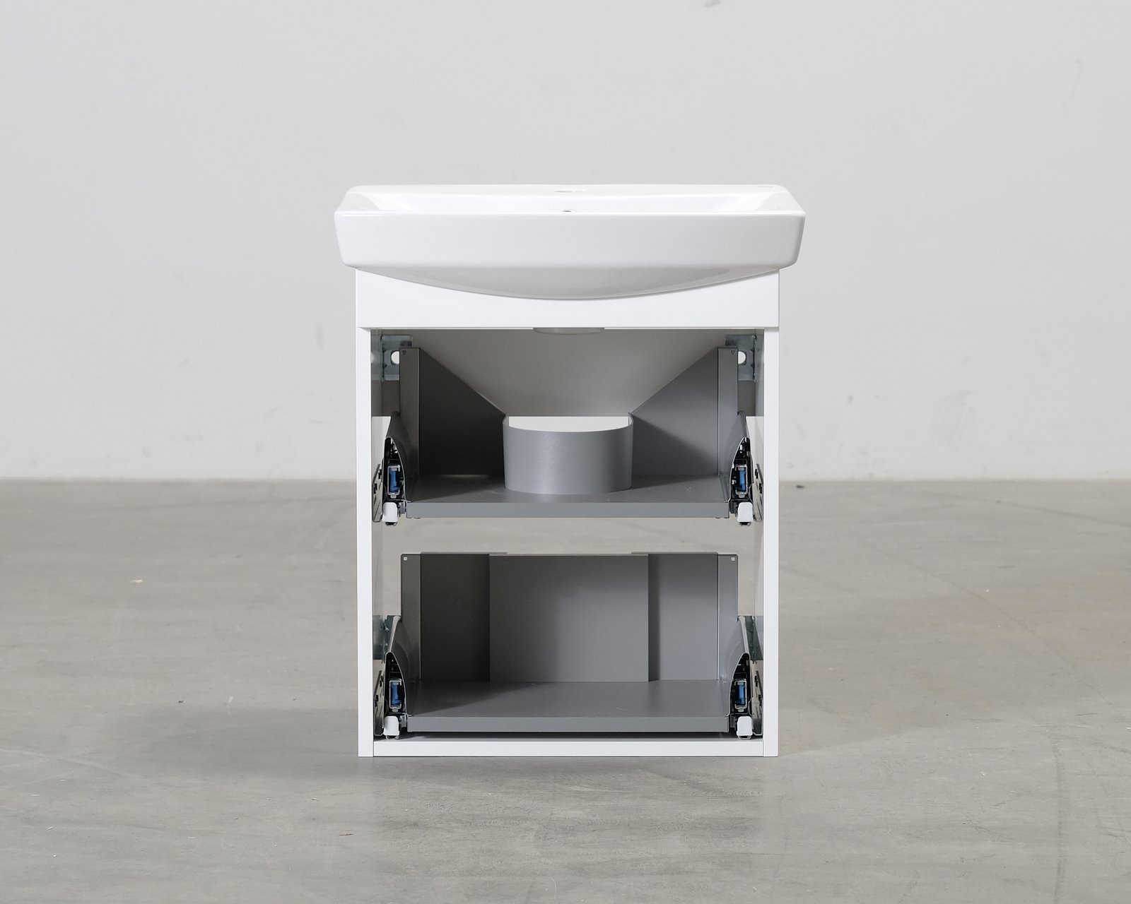 Du kan anpassa Hafa Life-badskåpet efter din smak genom att välja de frontpaneler du önskar. Tvättstället är tillverkat i porslin. Dörrarna saknas.