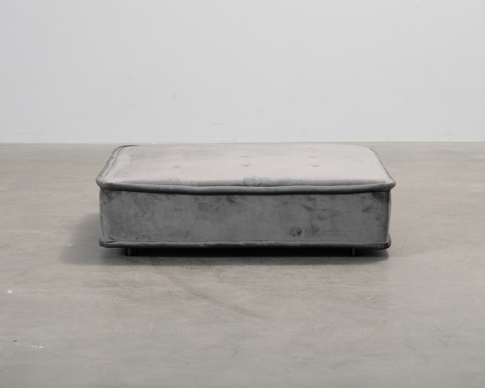 Hillsta fotpall med grå sammetsklädsel. Den kviltade ytan ger ett elegant uttryck. Oanvänd.