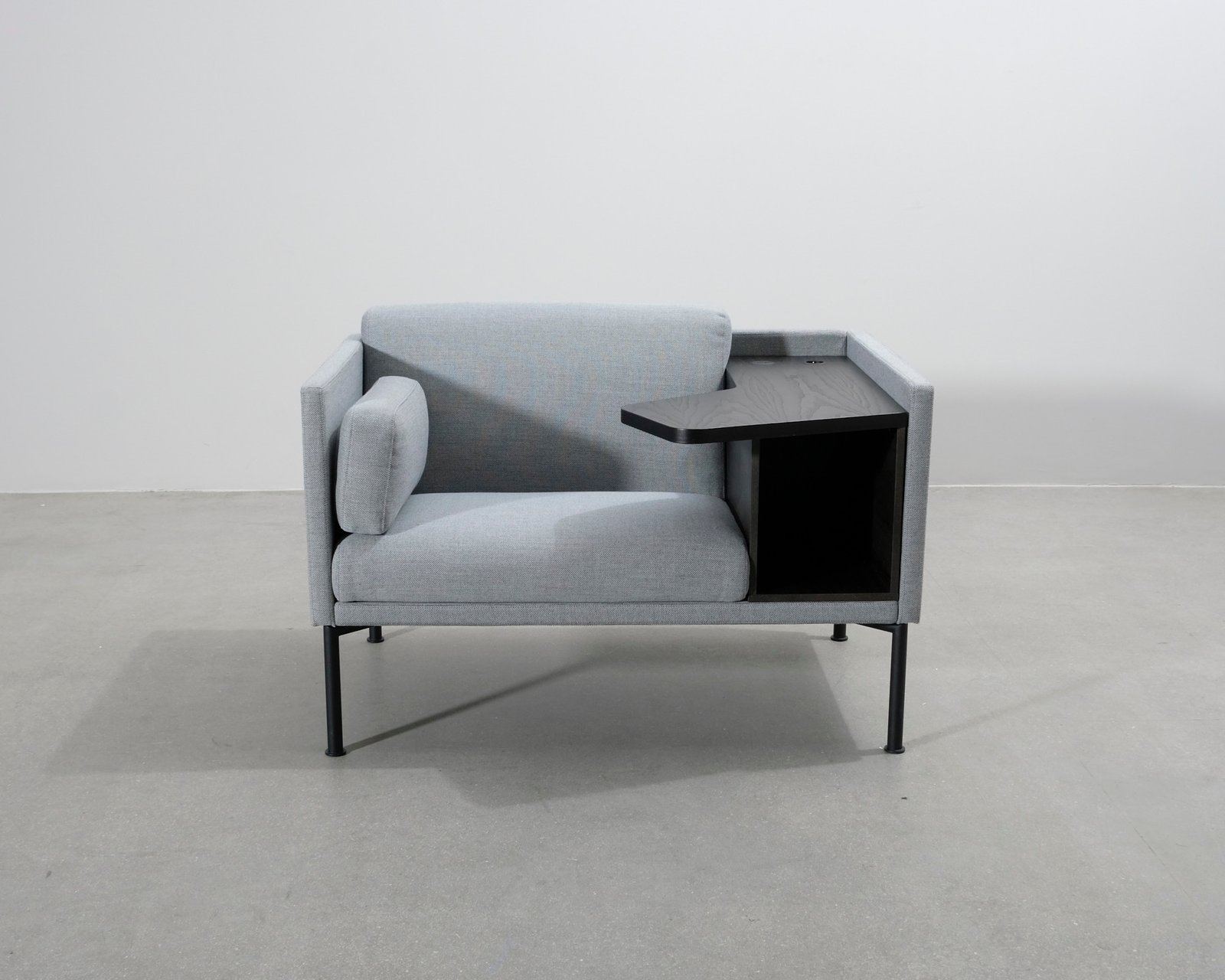 Fåtölj med låg rygg från möbelserien Mute Focus från Horreds. Fåtöljen har förvaringsutrymme och en praktisk bordsskiva med el- och USB-uttag. Fåtöljen är lämplig till exempel för moderna kontorsutrymmen. Fint skick.