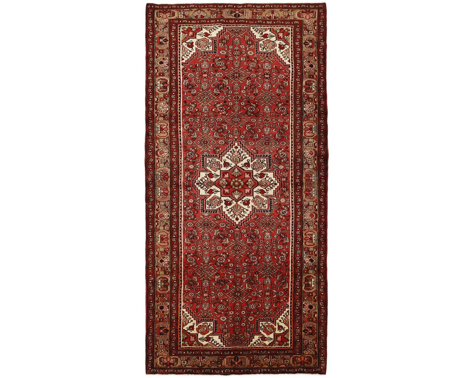 Hosseinabad-mattorna är handknutna ullmattor som är kända för sin robusta konstruktion och sin lämplighet för vardagsbruk. Mönstren är oftast heltäckande och fritt uppbyggda, med ett kraftfullt formspråk. Färgskalan domineras av röda och bruna toner. Mattorna är knutna med ghiordesknut i en täthet på 150 000–250 000 knutar per kvadratmeter. Oanvänd.