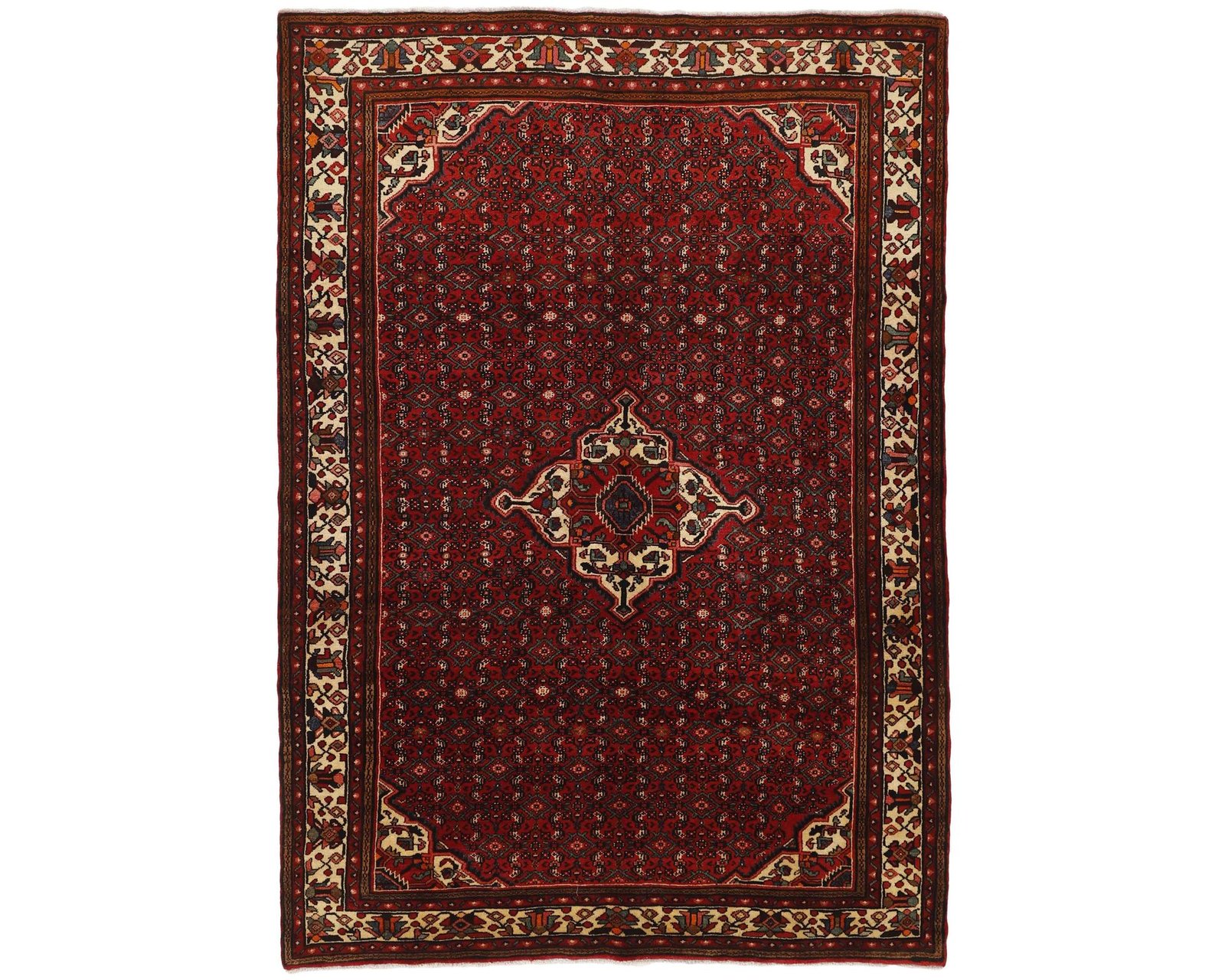 Hosseinabad-mattorna är handknutna ullmattor som är kända för sin robusta konstruktion och sin lämplighet för vardagsbruk. Mönstren är oftast heltäckande och fritt uppbyggda, med ett kraftfullt formspråk. Färgskalan domineras av röda och bruna toner. Mattorna är knutna med ghiordesknut i en täthet på 150 000–250 000 knutar per kvadratmeter. Oanvänd.