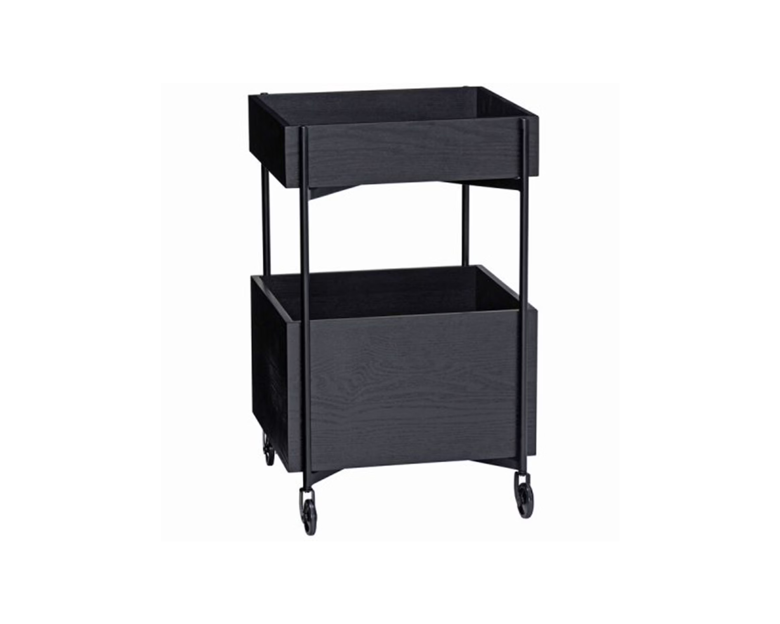 Fresh från Hübsch är en elegant serveringsvagn som förenar funktionalitet med modern design. Vagnen är tillverkad av MDF och har en vacker yta i askfanér som ger en naturlig struktur och stilren känsla. Med två rymliga hyllplan och smidiga hjul är Frest lätt att flytta och användbar i många sammanhang. Perfekt som serveringsvagn, sidobord eller förvaring – ett mångsidigt tillskott till det moderna hemmet. Hörnen på den nedre hyllan är skadade och skruvhålen är något slitna, vilket innebär att serveringsvagnen kan vara något instabil när man använder vanliga skruvar.