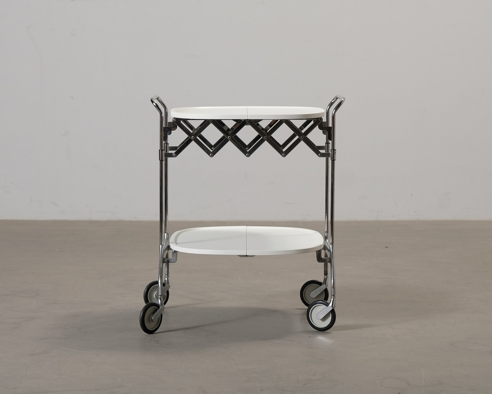 Kartells Gastone är en elegant och mångsidig serveringsvagn som förenar italiensk design med praktisk funktion. Vagnen, designad av Antonio Citterio och Oliver Löw, är tillverkad av kromat stål och slitstark termoplast, vilket gör den både lätt och hållbar. De två hyllplanen ger gott om utrymme för servering eller förvaring, och de stora hjulen gör vagnen enkel att flytta mellan rum. Gastone kan enkelt fällas ihop för smidig förvaring och passar därför lika bra i små hem som vid festliga tillfällen. Dess tidlösa formgivning och diskreta färg ger en känsla av elegans – en perfekt kombination av funktionalitet och modern italiensk stil. Bordsskivan visar lätt slitage och den nedre delen är lite stel att sätta på plats. Helhetsintrycket är fint.