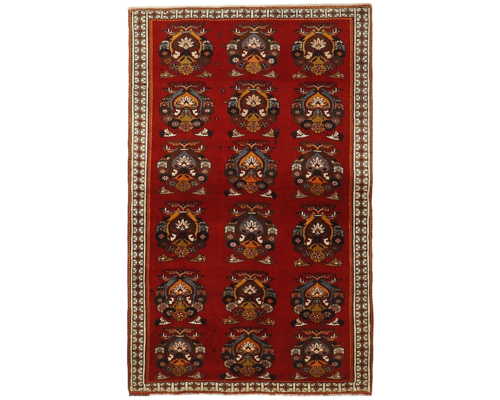 Kashghai-mattorna är handknutna ullmattor som kännetecknas av djupa färger, särskilt rika röda toner, och en tät konstruktion. Det geometriska mönstret är ofta uppbyggt med medaljonger längs en central axel eller placerade i mitten och hörnen, medan den övriga ytan fylls av mindre geometriska motiv. Traditionella mönster som Harshang och inslag inspirerade av Persepolis är vanliga och ger mattorna ett mycket detaljrikt uttryck. Knuttätheten varierar mellan 150 000 och 250 000 knutar per kvadratmeter. Oanvänd.