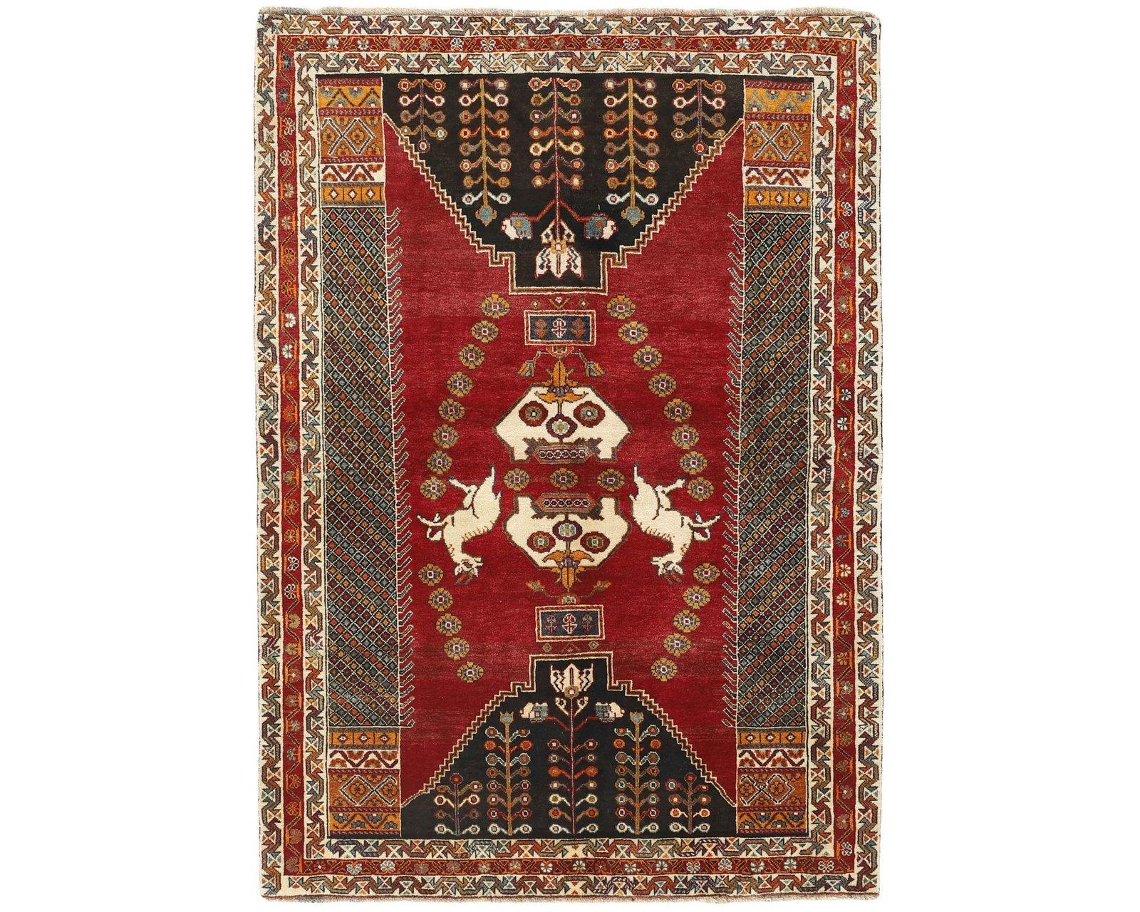 Kashghai-mattorna är handknutna ullmattor som kännetecknas av djupa färger, särskilt rika röda toner, och en tät konstruktion. Det geometriska mönstret är ofta uppbyggt med medaljonger längs en central axel eller placerade i mitten och hörnen, medan den övriga ytan fylls av mindre geometriska motiv. Traditionella mönster som Harshang och inslag inspirerade av Persepolis är vanliga och ger mattorna ett mycket detaljrikt uttryck. Knuttätheten varierar mellan 150 000 och 250 000 knutar per kvadratmeter. Oanvänd.