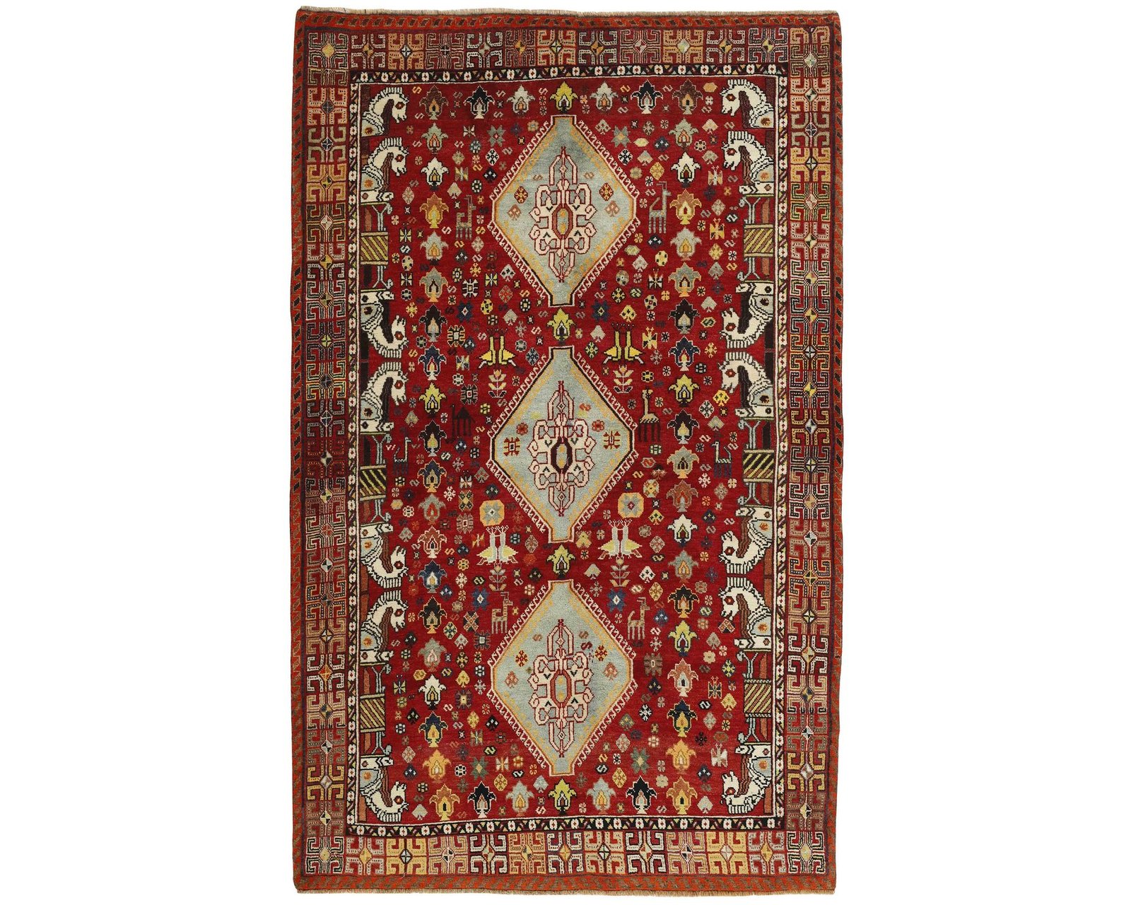 Kashghai-mattorna är handknutna ullmattor som kännetecknas av djupa färger, särskilt rika röda toner, och en tät konstruktion. Det geometriska mönstret är ofta uppbyggt med medaljonger längs en central axel eller placerade i mitten och hörnen, medan den övriga ytan fylls av mindre geometriska motiv. Traditionella mönster som Harshang och inslag inspirerade av Persepolis är vanliga och ger mattorna ett mycket detaljrikt uttryck. Knuttätheten varierar mellan 150 000 och 250 000 knutar per kvadratmeter. Oanvänd.