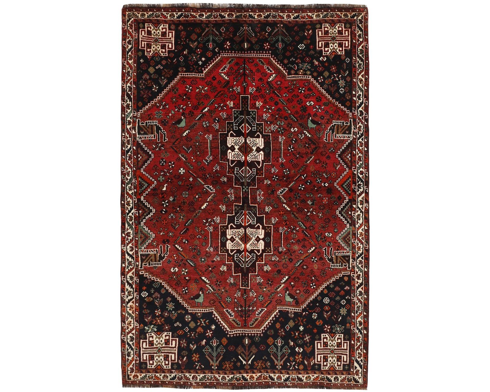 Kashghai-mattorna är handknutna ullmattor som kännetecknas av djupa färger, särskilt rika röda toner, och en tät konstruktion. Det geometriska mönstret är ofta uppbyggt med medaljonger längs en central axel eller placerade i mitten och hörnen, medan den övriga ytan fylls av mindre geometriska motiv. Traditionella mönster som Harshang och inslag inspirerade av Persepolis är vanliga och ger mattorna ett mycket detaljrikt uttryck. Knuttätheten varierar mellan 150 000 och 250 000 knutar per kvadratmeter. Oanvänd.