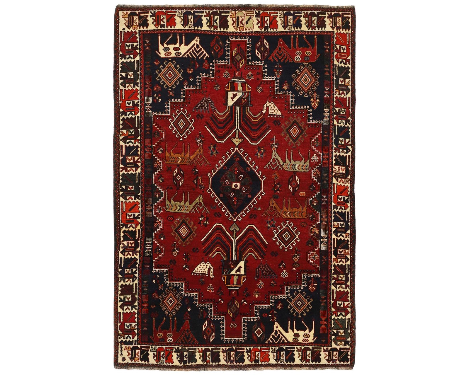 Kashghai-mattorna är handknutna ullmattor som kännetecknas av djupa färger, särskilt rika röda toner, och en tät konstruktion. Det geometriska mönstret är ofta uppbyggt med medaljonger längs en central axel eller placerade i mitten och hörnen, medan den övriga ytan fylls av mindre geometriska motiv. Traditionella mönster som Harshang och inslag inspirerade av Persepolis är vanliga och ger mattorna ett mycket detaljrikt uttryck. Knuttätheten varierar mellan 150 000 och 250 000 knutar per kvadratmeter. Oanvänd.