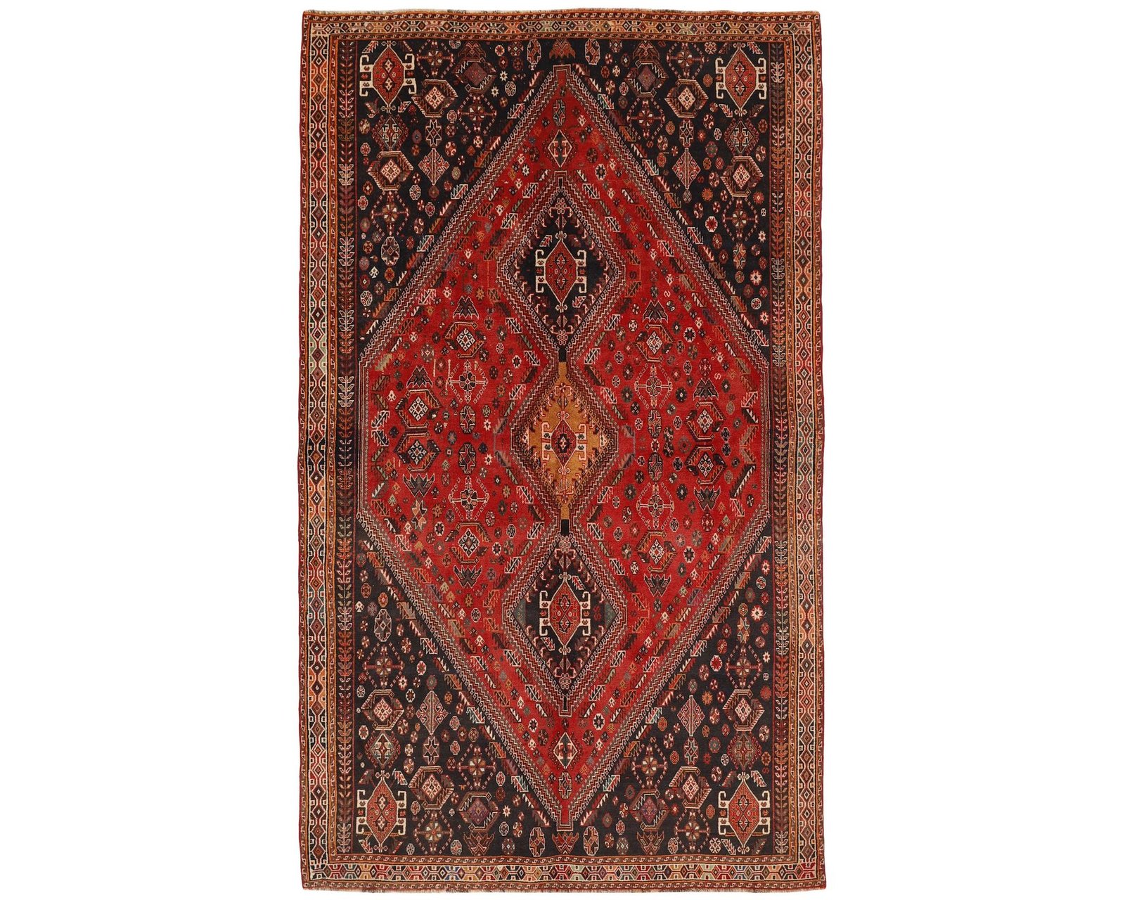 Kashghai-mattorna är handknutna ullmattor som kännetecknas av djupa färger, särskilt rika röda toner, och en tät konstruktion. Det geometriska mönstret är ofta uppbyggt med medaljonger längs en central axel eller placerade i mitten och hörnen, medan den övriga ytan fylls av mindre geometriska motiv. Traditionella mönster som Harshang och inslag inspirerade av Persepolis är vanliga och ger mattorna ett mycket detaljrikt uttryck. Knuttätheten varierar mellan 150 000 och 250 000 knutar per kvadratmeter. Oanvänd.