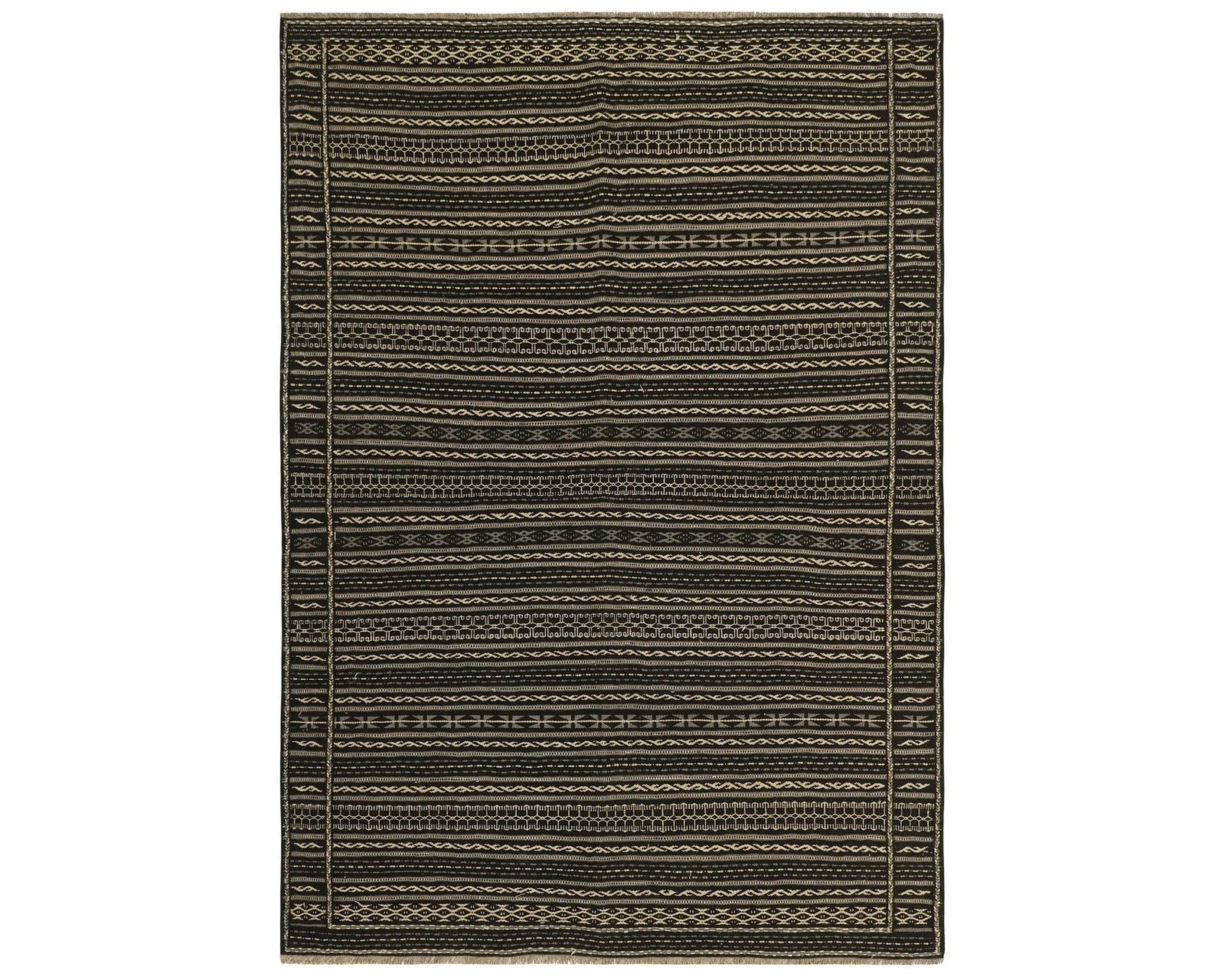 Kelim mattor är slätvävda ullmattor som tillverkas av nomadstammar i Persien. Dessa mattor tillverkas enligt traditionella handarbetsmetoder, vilket gör varje matta unik. Denna matta är tillverkad i Kordi-stilen, som kännetecknas av geometriska mönster arrangerade i horisontella ränder. Oanvänd.