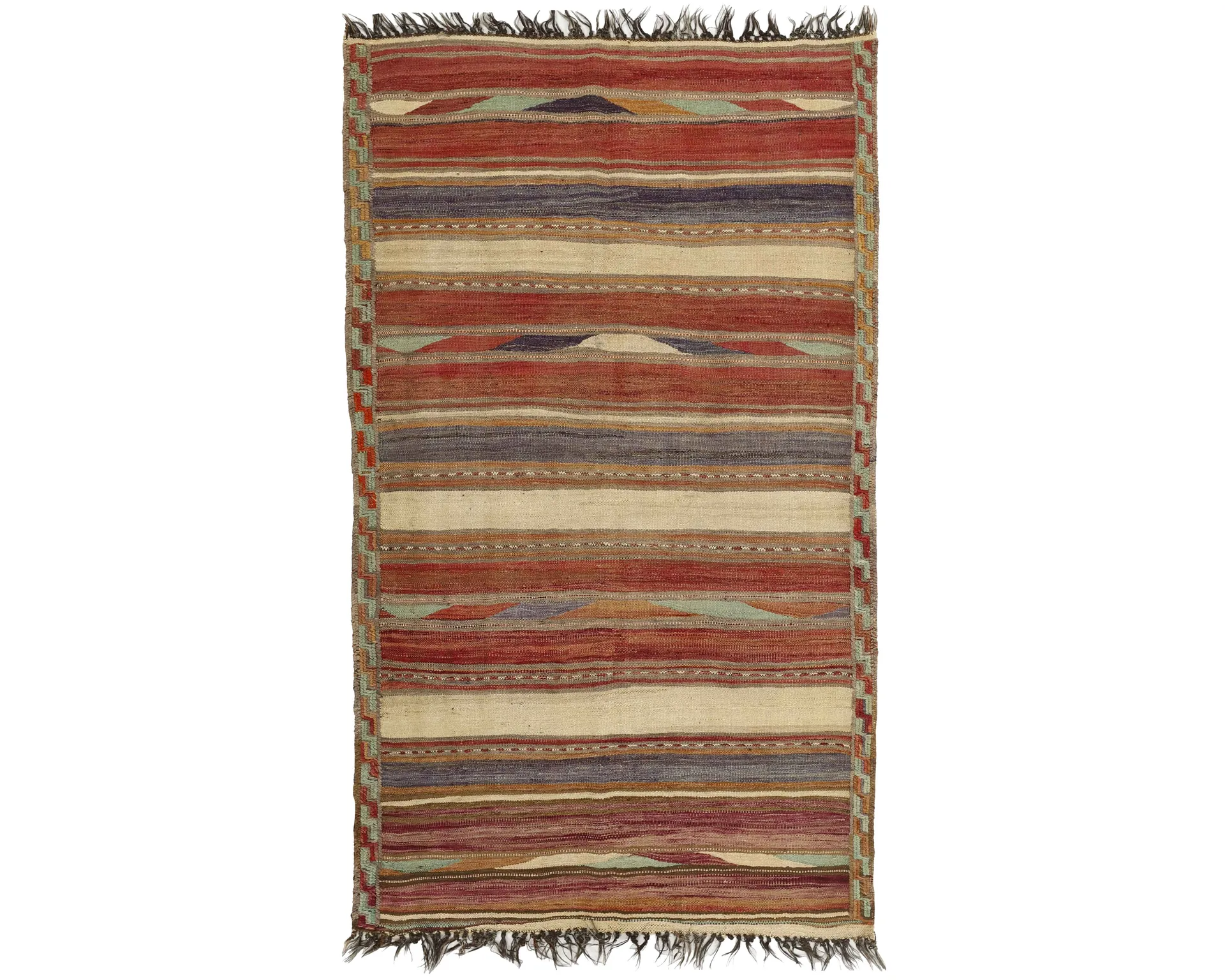 Denna handvävda matta kombinerar persiska mönster med den gamla flatvävstraditionen. Den är en vacker kombination av persiska element och modern stil. Dess geometriska mönster och varma färger gör denna typ av matta mycket populär i moderna hem. Oanvänd.