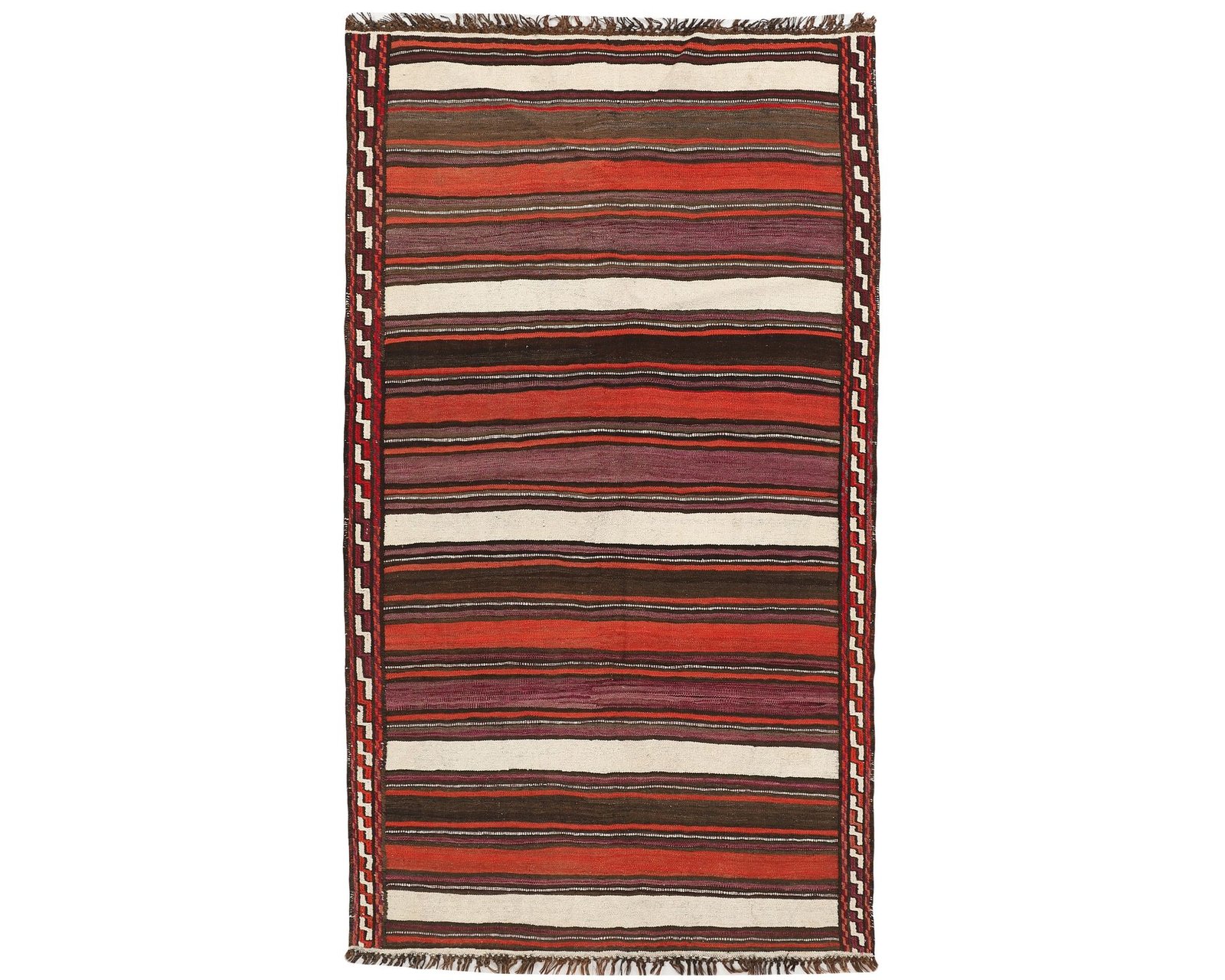 Denna handvävda matta kombinerar persiska mönster med den gamla flatvävstraditionen. Den är en vacker kombination av persiska element och modern stil. Dess geometriska mönster och varma färger gör denna typ av matta mycket populär i moderna hem. Oanvänd.