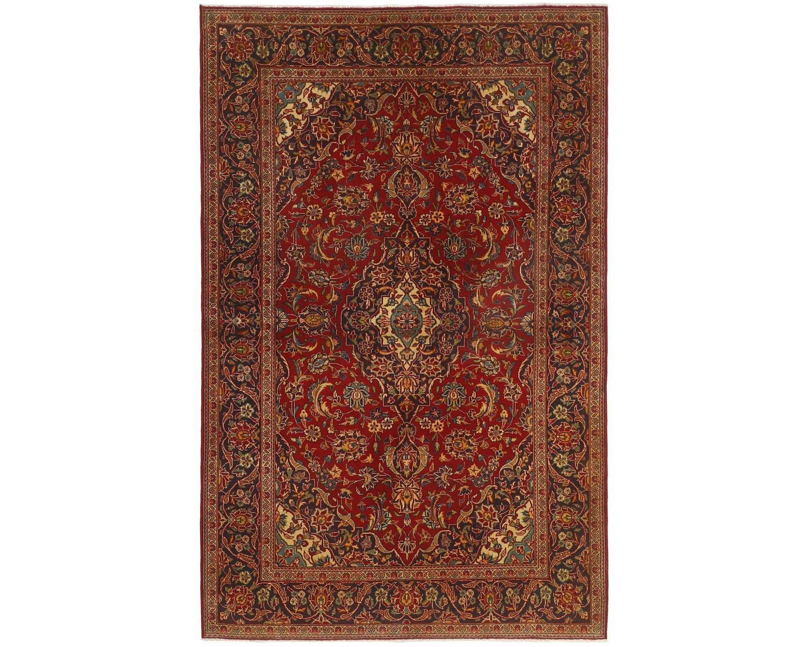 Keshan-mattorna är handknutna ullmattor som är kända för sina finstämda, heltäckande mönster med en central medaljong. Ytan är tätt fylld med blommotiv och slingrande rankor, medan kanterna ofta pryds av Herati-motiv och små rosetter. Vanliga färgkombinationer är en röd botten med blå medaljong, kompletterad av mjukare accenttoner. Knuttätheten varierar mellan 150 000 och 250 000 knutar per kvadratmeter. Oanvänd.