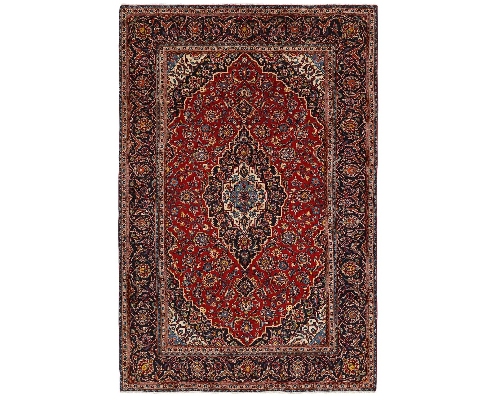 Keshan-mattorna är handknutna ullmattor som är kända för sina finstämda, heltäckande mönster med en central medaljong. Ytan är tätt fylld med blommotiv och slingrande rankor, medan kanterna ofta pryds av Herati-motiv och små rosetter. Vanliga färgkombinationer är en röd botten med blå medaljong, kompletterad av mjukare accenttoner. Knuttätheten varierar mellan 150 000 och 250 000 knutar per kvadratmeter. Oanvänd.