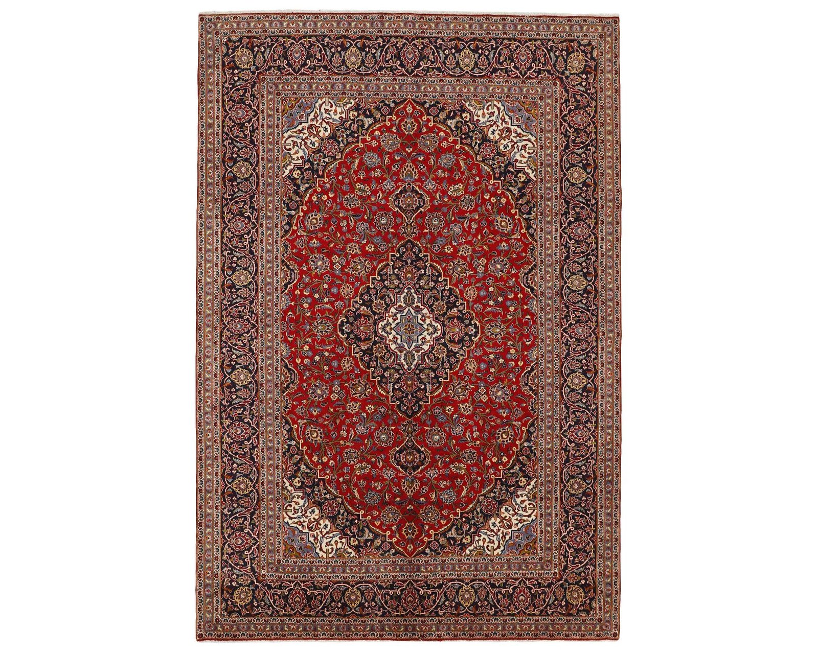 Keshan-mattorna är handknutna ullmattor som är kända för sina finstämda, heltäckande mönster med en central medaljong. Ytan är tätt fylld med blommotiv och slingrande rankor, medan kanterna ofta pryds av Herati-motiv och små rosetter. Vanliga färgkombinationer är en röd botten med blå medaljong, kompletterad av mjukare accenttoner. Knuttätheten varierar mellan 150 000 och 250 000 knutar per kvadratmeter. Oanvänd.