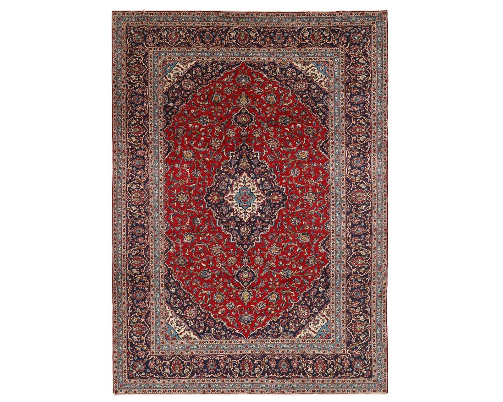 Keshan-mattorna är handknutna ullmattor som är kända för sina finstämda, heltäckande mönster med en central medaljong. Ytan är tätt fylld med blommotiv och slingrande rankor, medan kanterna ofta pryds av Herati-motiv och små rosetter. Vanliga färgkombinationer är en röd botten med blå medaljong, kompletterad av mjukare accenttoner. Knuttätheten varierar mellan 150 000 och 250 000 knutar per kvadratmeter. Oanvänd.