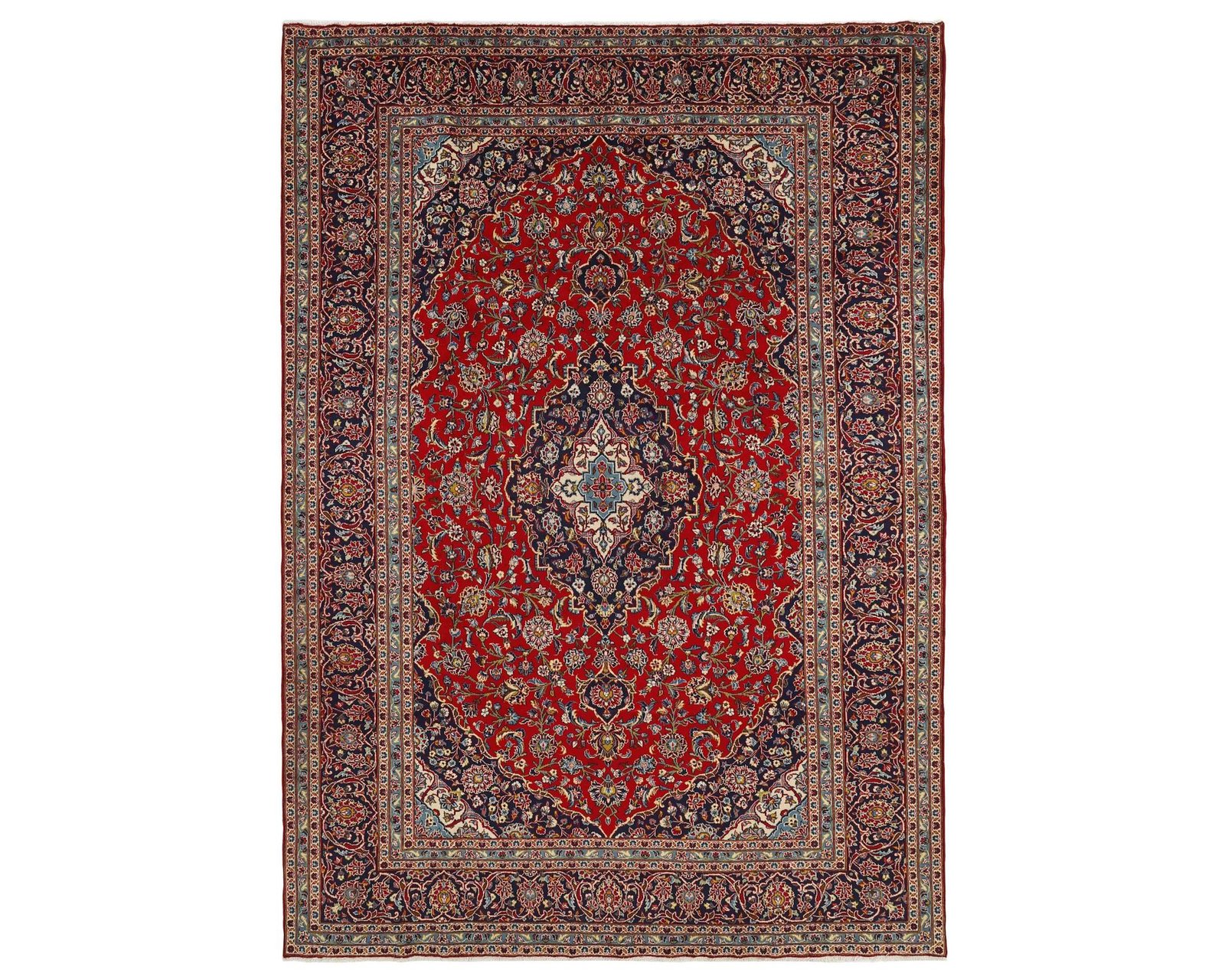 Keshan-mattorna är handknutna ullmattor som är kända för sina finstämda, heltäckande mönster med en central medaljong. Ytan är tätt fylld med blommotiv och slingrande rankor, medan kanterna ofta pryds av Herati-motiv och små rosetter. Vanliga färgkombinationer är en röd botten med blå medaljong, kompletterad av mjukare accenttoner. Knuttätheten varierar mellan 150 000 och 250 000 knutar per kvadratmeter. Oanvänd.