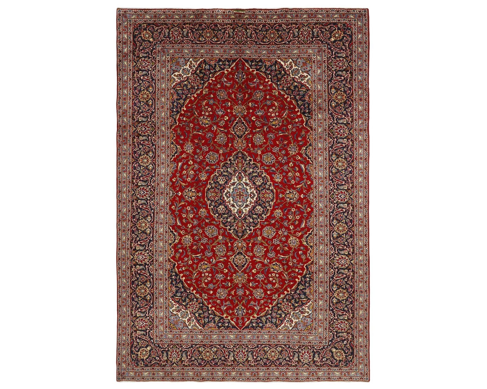 Keshan-mattorna är handknutna ullmattor som är kända för sina finstämda, heltäckande mönster med en central medaljong. Ytan är tätt fylld med blommotiv och slingrande rankor, medan kanterna ofta pryds av Herati-motiv och små rosetter. Vanliga färgkombinationer är en röd botten med blå medaljong, kompletterad av mjukare accenttoner. Knuttätheten varierar mellan 150 000 och 250 000 knutar per kvadratmeter. Oanvänd.
