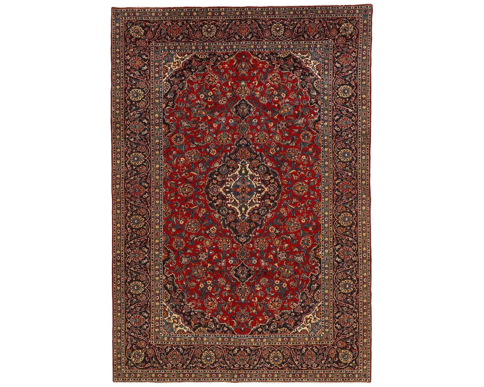 Keshan-mattorna är handknutna ullmattor som är kända för sina finstämda, heltäckande mönster med en central medaljong. Ytan är tätt fylld med blommotiv och slingrande rankor, medan kanterna ofta pryds av Herati-motiv och små rosetter. Vanliga färgkombinationer är en röd botten med blå medaljong, kompletterad av mjukare accenttoner. Knuttätheten varierar mellan 150 000 och 250 000 knutar per kvadratmeter. Oanvänd.