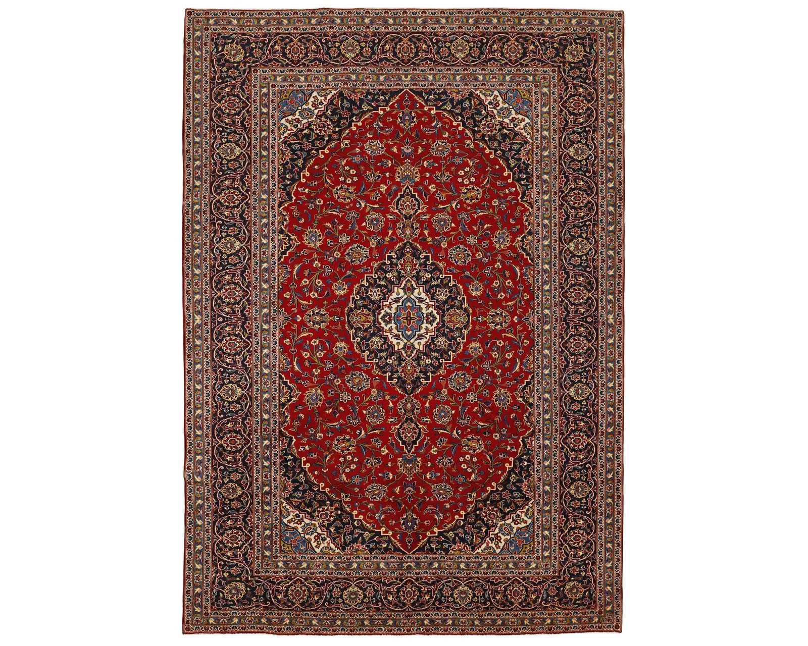 Keshan-mattorna är handknutna ullmattor som är kända för sina finstämda, heltäckande mönster med en central medaljong. Ytan är tätt fylld med blommotiv och slingrande rankor, medan kanterna ofta pryds av Herati-motiv och små rosetter. Vanliga färgkombinationer är en röd botten med blå medaljong, kompletterad av mjukare accenttoner. Knuttätheten varierar mellan 150 000 och 250 000 knutar per kvadratmeter. Oanvänd.