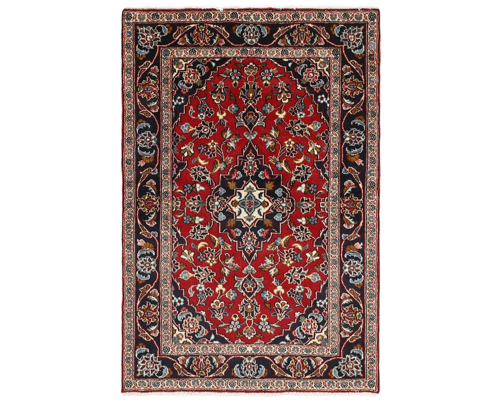 Keshan-mattorna är handknutna ullmattor som är kända för sina finstämda, heltäckande mönster med en central medaljong. Ytan är tätt fylld med blommotiv och slingrande rankor, medan kanterna ofta pryds av Herati-motiv och små rosetter. Vanliga färgkombinationer är en röd botten med blå medaljong, kompletterad av mjukare accenttoner. Knuttätheten varierar mellan 150 000 och 250 000 knutar per kvadratmeter. Oanvänd.