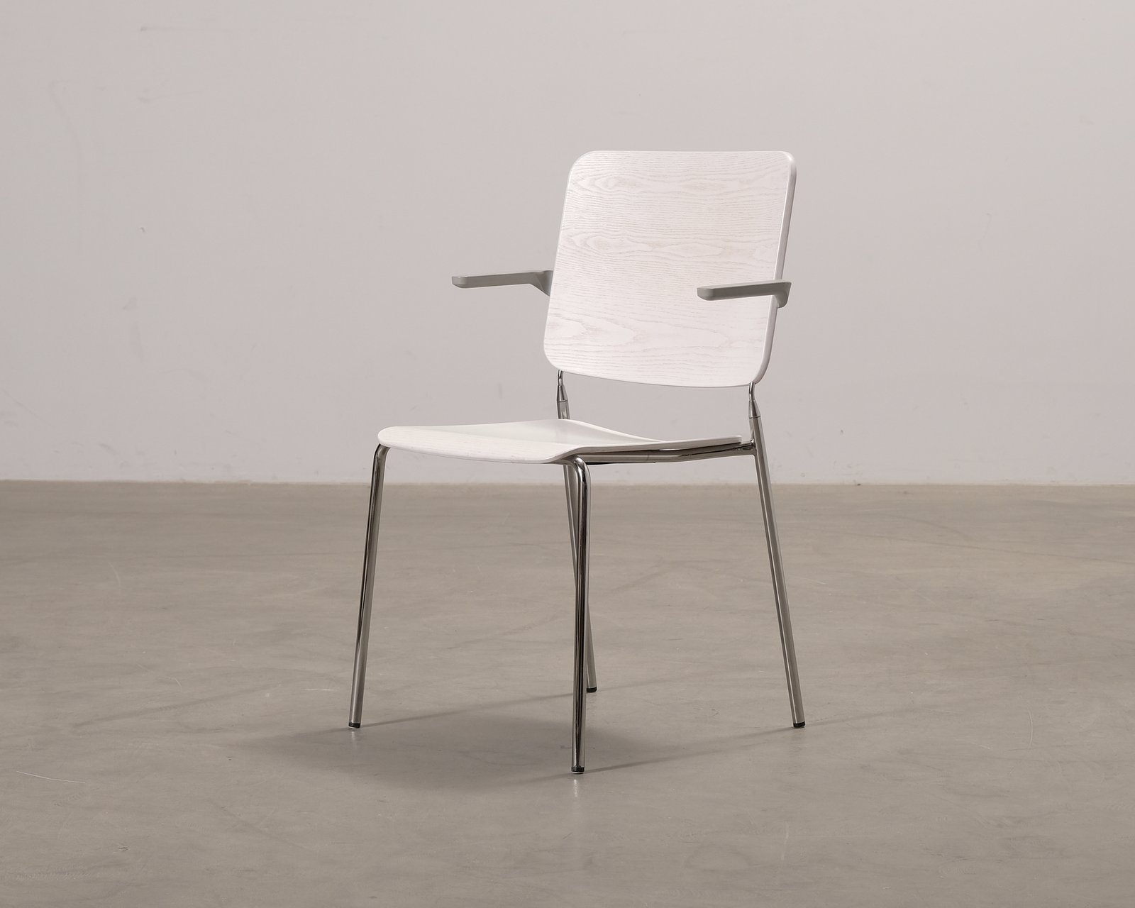 En minimalistisk och lätt stol som passar som matstol i hemmet, men också på kontor och i offentliga miljöer. Små spår av användning. Helhetsintrycket är fint.