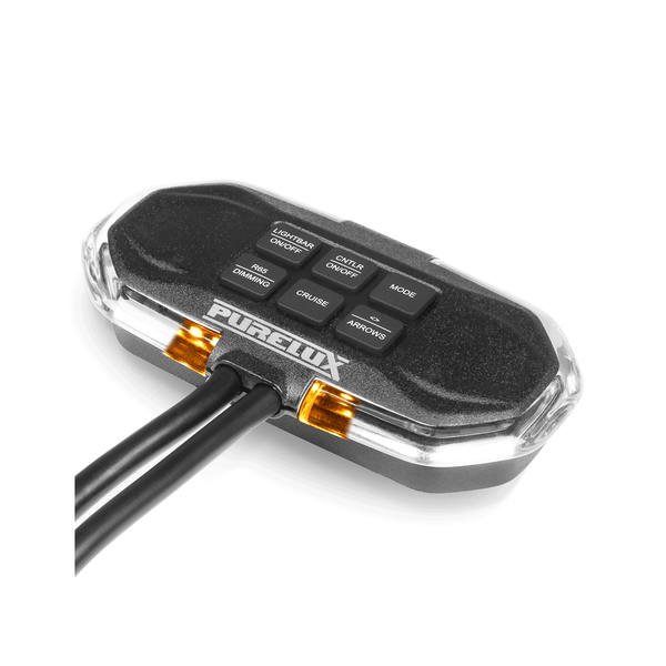Kontrollpanel för Purelux Flash Gen2 blixtljusramper, som gör att du kan styra ljusets funktioner direkt från förarplatsen. Kontrollpanelen kan ställas in så att den simulerar blixtljusrampens driftläge, vilket är praktiskt då föraren inte behöver lämna fordonet för att kontrollera vilken funktion som är aktiv!