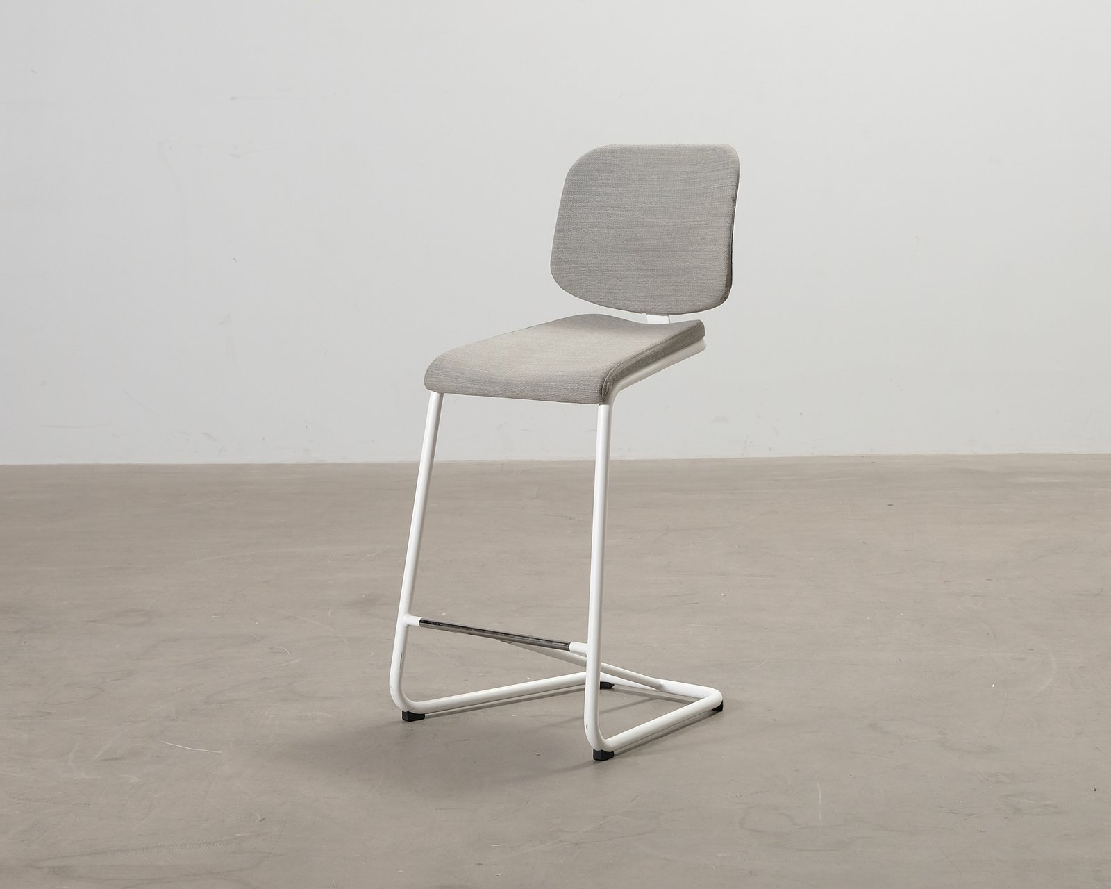 Add är en mycket bekväm pall, där det är lätt att hitta en naturlig sittställning. Grå tygklädsel och vit metallram. Designad av Anya Sebton. Några blekta fläckar på klädseln, som inte gick bort i tvätten. Normalt slitage på klädsel och ben. Helhetsintrtycket är bra.