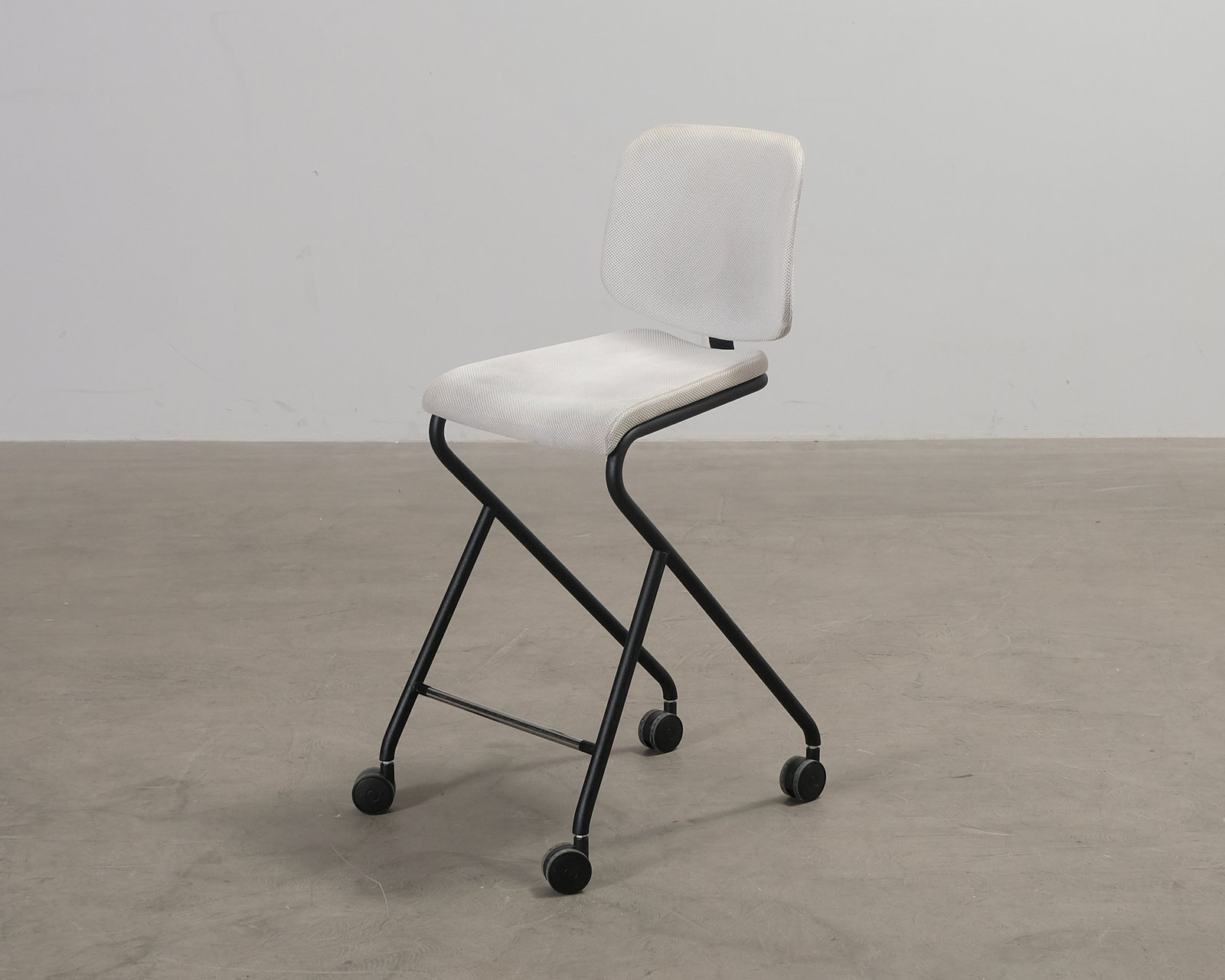 Add är en mycket bekväm pall, där det är lätt att hitta en naturlig sittställning. Klädsel i ljust tyg och ram i svart metall. Hjul under. Designad av Anya Sebton. Stolens klädsel har slitage och missfärgningar. Normalt slitage på benen.
