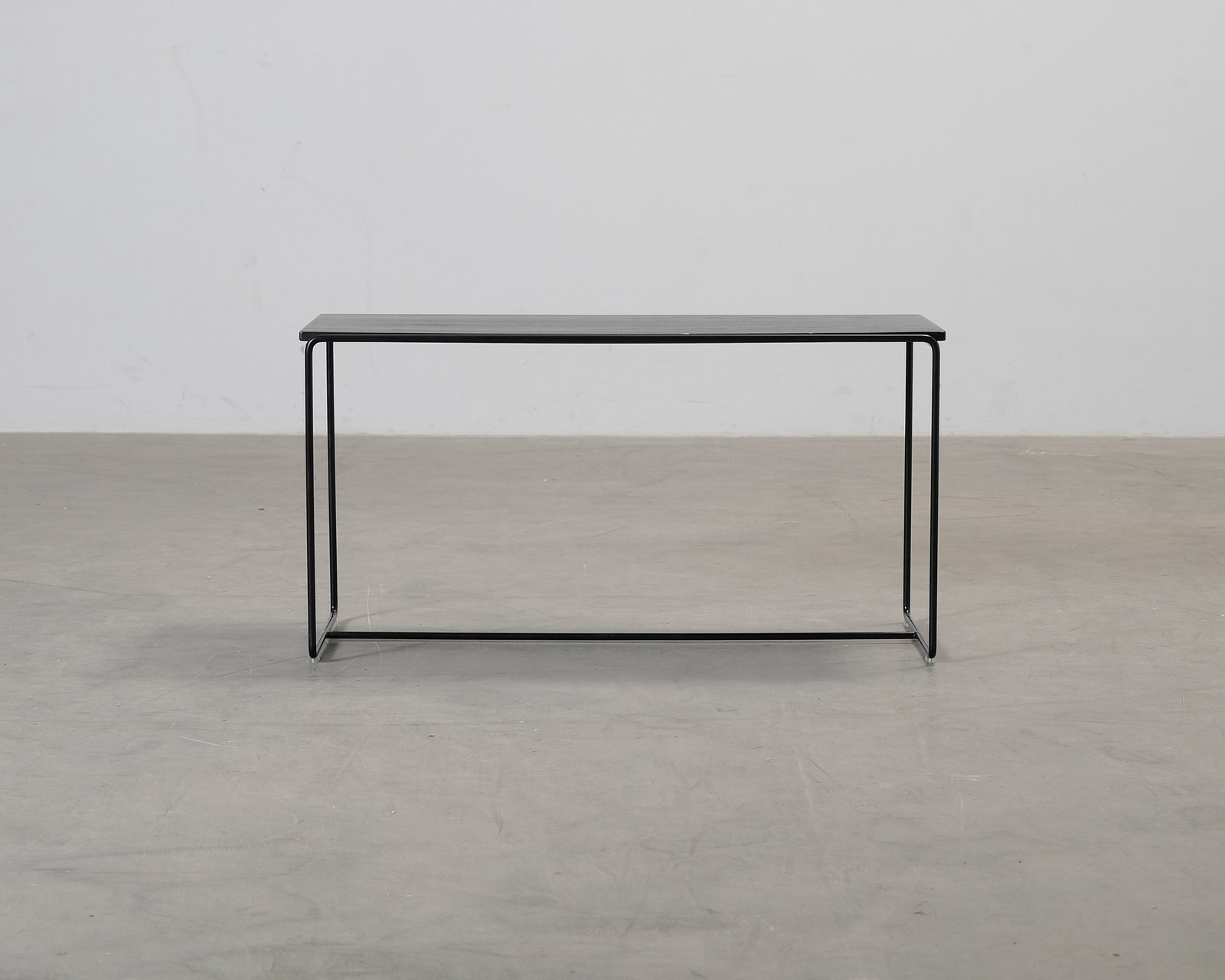 Minimalistiskt och modernt soffbord som enkelt passar ihop med olika inredningsstilar. Smal metallram och träskiva. Slitage, bucklor och repor.