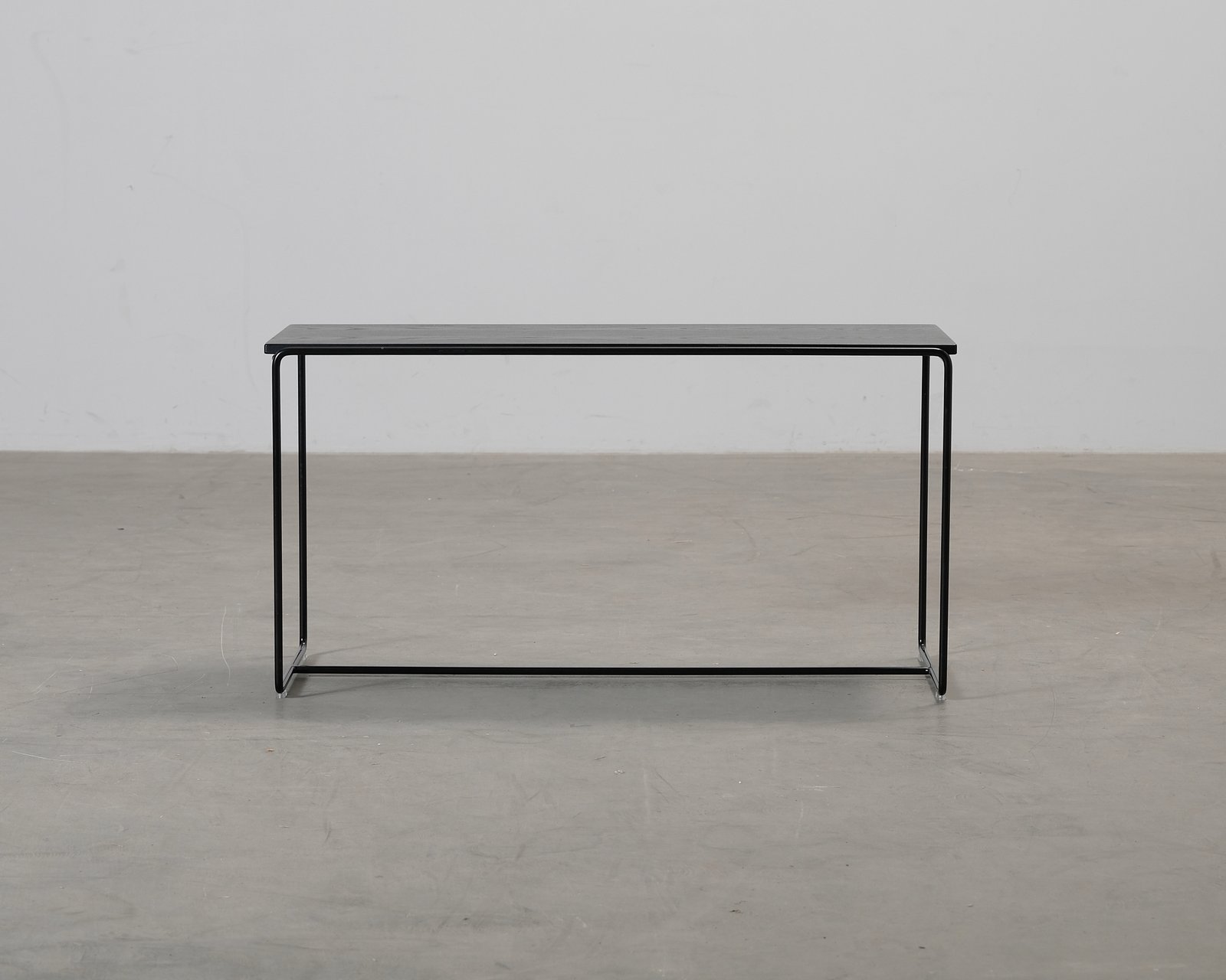 Minimalistiskt och modernt soffbord som enkelt passar ihop med olika inredningsstilar. Smal metallram och träskiva. Slitage och repor. Helhetsintrycket är bra.