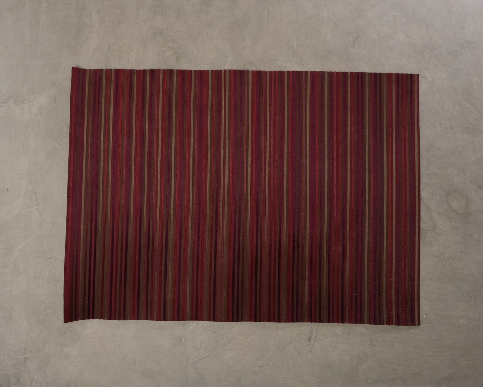Matta från Ligne Roset med röd basfärg och ett randigt mönster. Storlek: 170 x 240 cm. Helhetsintrycket är gott.