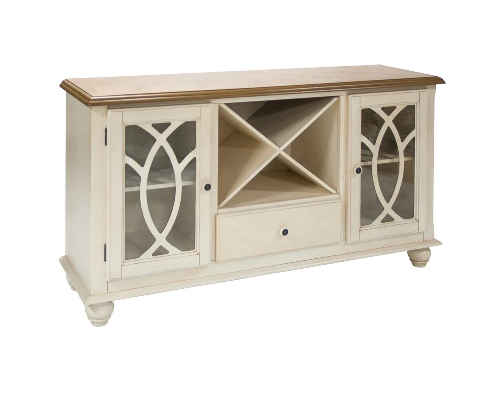 Lily-skänk imponerar med sitt rustika utseende och erbjuder gott om förvaringsutrymme med två skåp, en öppen hylla och en låda. Tillverkad av trä, MDF och ekfanér.