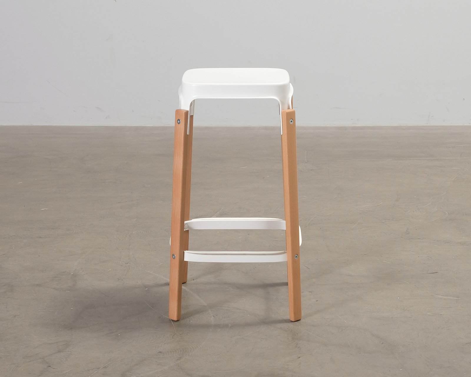 Ronan & Erwan Bouroullec designade pallen Steelwood för Magis. Den minimalistiska barstolen smälter lätt in i en mängd olika inredningsstilar. Slitage på sitsen.
