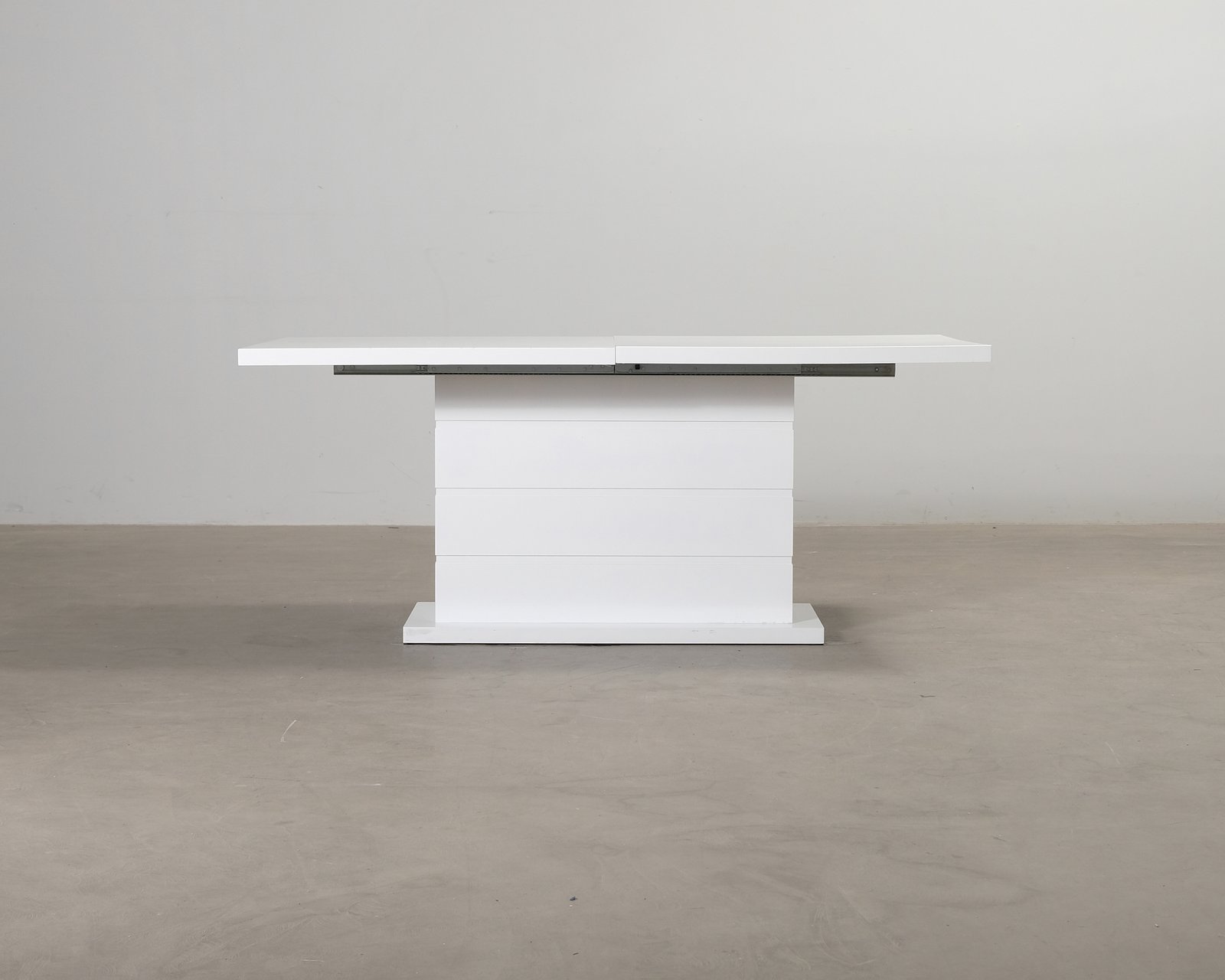Ett elegant 180 cm vitt matbord som skapar en modern look i ditt hem. 220 cm med tilläggsskivan. Något slitage på kanterna på bordsskivan och bordsbenet. Bordsskivorna är på lite olika nivå och det är en liten tröskel mellan dem.
