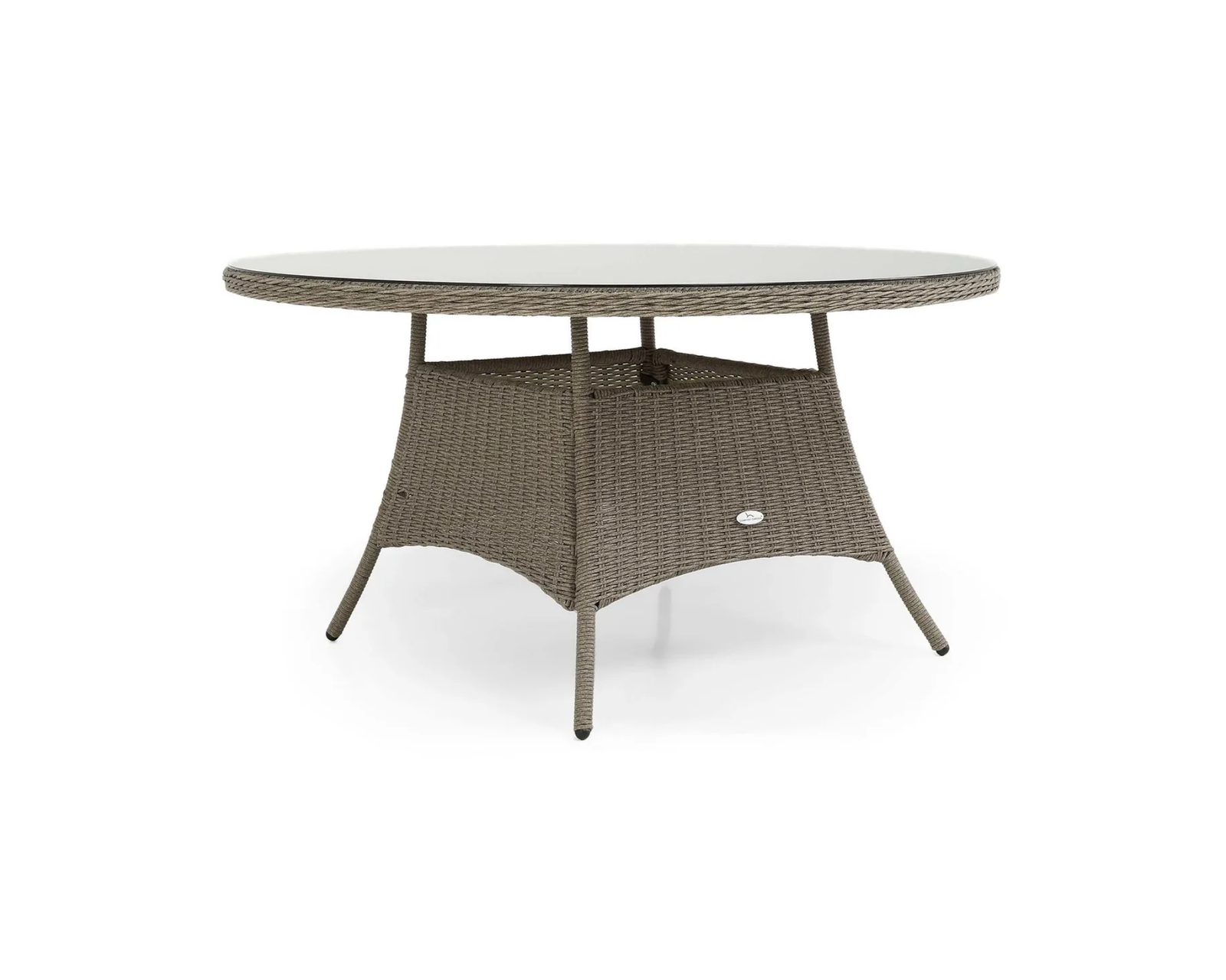 Snyggt och praktiskt trädgårdsbord med en diameter på 140 cm. Stomme i polyrotting och bordsskiva i glas. Marcus-bordet är tillverkat av väderbeständiga material som kräver mycket lite underhåll. Skadorna som syns i rottingflätningen finns på bordsskivan. Helhetsintrycket är bra.