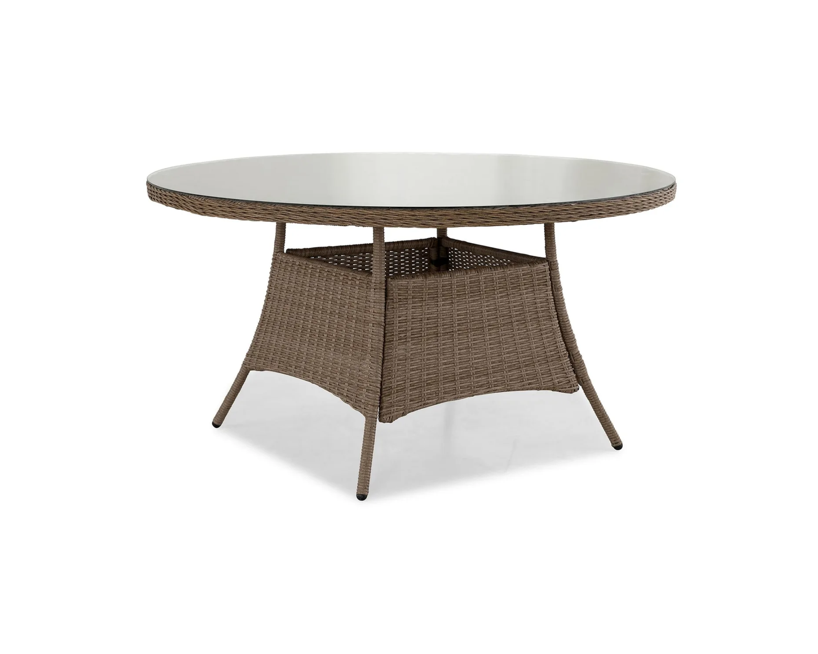 Snyggt och praktiskt trädgårdsbord med en diameter på 140 cm. Stomme i polyrotting och bordsskiva i glas. Marcus-bordet är tillverkat av väderbeständiga material som kräver mycket lite underhåll. Små skador på undersidan av rottingflätningen. Helhetsintrycket är bra.