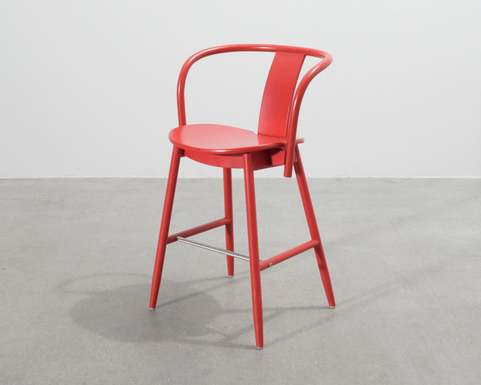 Icha stolen från Massproductions har svängda armstöd, en böjd sits och en stadig ram. Den röda stolen är designad av Chris Martin och tillverkad i bok. I utmärkt skick.