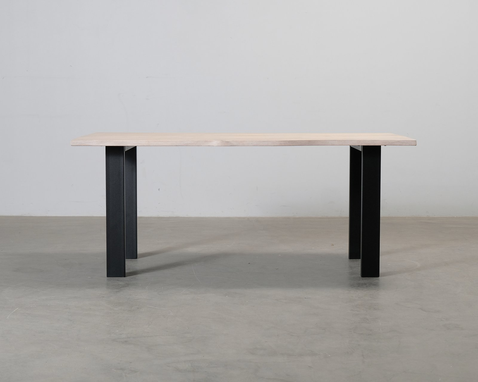 Ett stilrent och modernt matbord med en ljus, rektangulär bordsskiva och lätt organiska kantformer som ger ett naturligt och mjukt uttryck. De svarta, vinklade benen skapar en tydlig kontrast och ger stabilitet, vilket gör bordet till ett mångsidigt val för matplatsen, köket eller som arbetsbord. Den minimalistiska designen passar perfekt i skandinaviska interiörer. Fint skick.