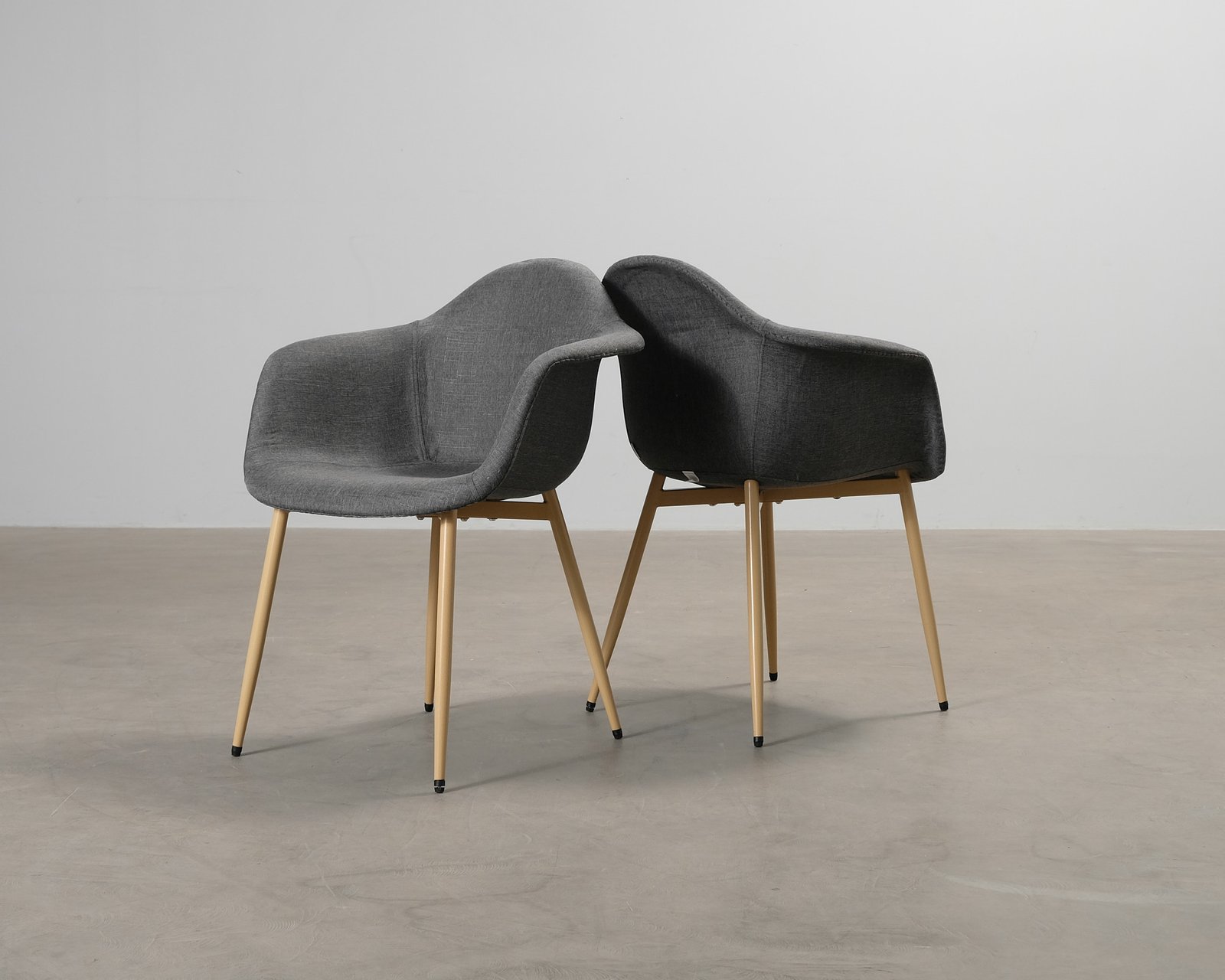 Matstol med grå tygklädsel och ben i beige metall. Små defekter i klädseln. Fästet för benen är defekt, ett ben är fast med 3 skruvar istället för 4. Detta påverkar inte användningen.