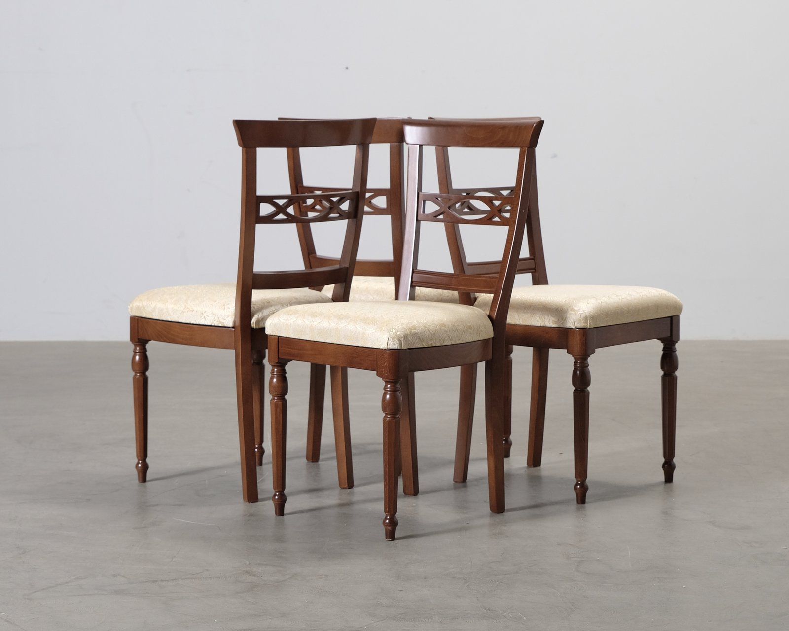 Denna tidlösa tygklädda stol ger ett klassiskt och diskret uttryck till hemmet. Träramen har en varm ton, och den rena designen gör stolen lätt att kombinera med olika inredningsstilar. Set on fyra stolar.