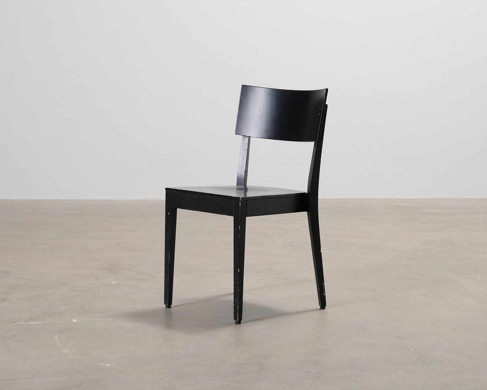 En svart matstol i trä med klassiskt utseende som kan kombineras med många olika inredningsstilar. Mycket slitage, bucklor och repor på trädelarna.