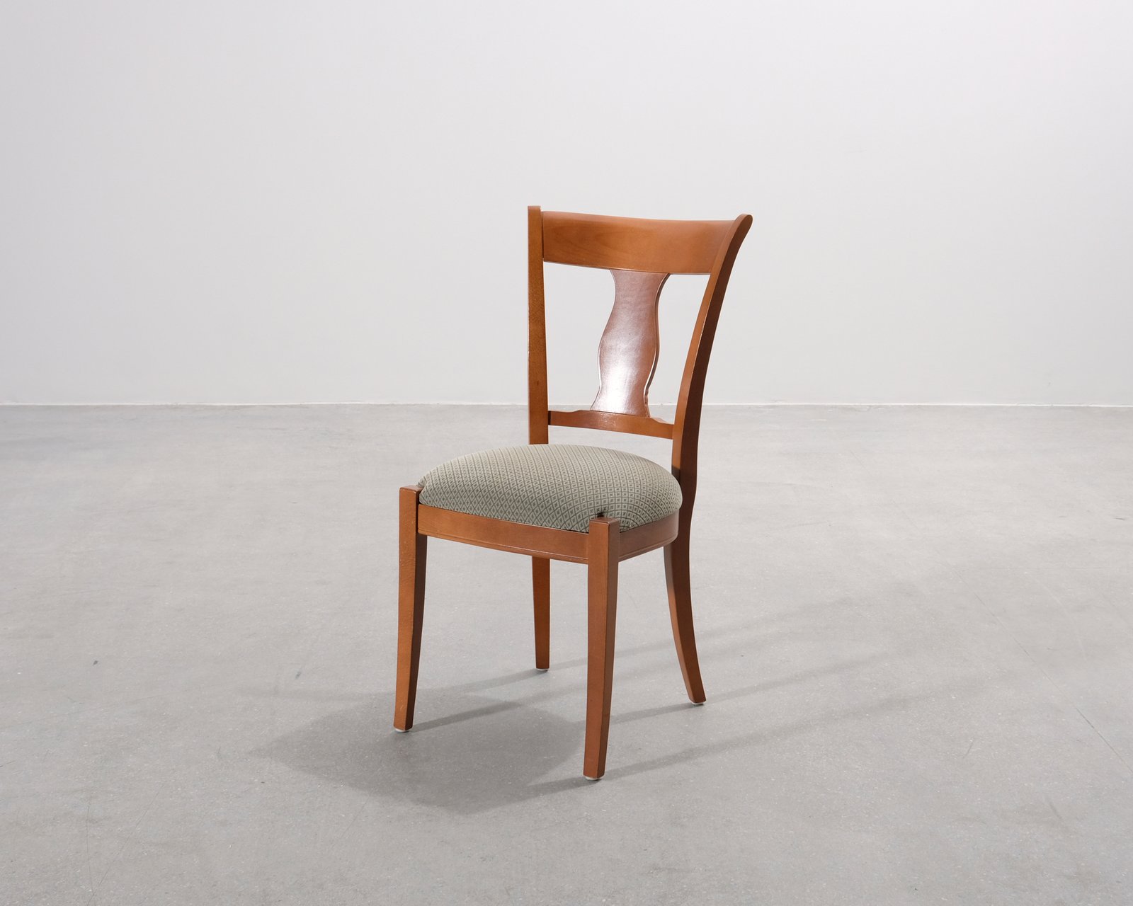 Matstol med grågrön tygsits. Stomme i trä. Små sprickor i träet. Lackeringen ställvis en aning sliten.