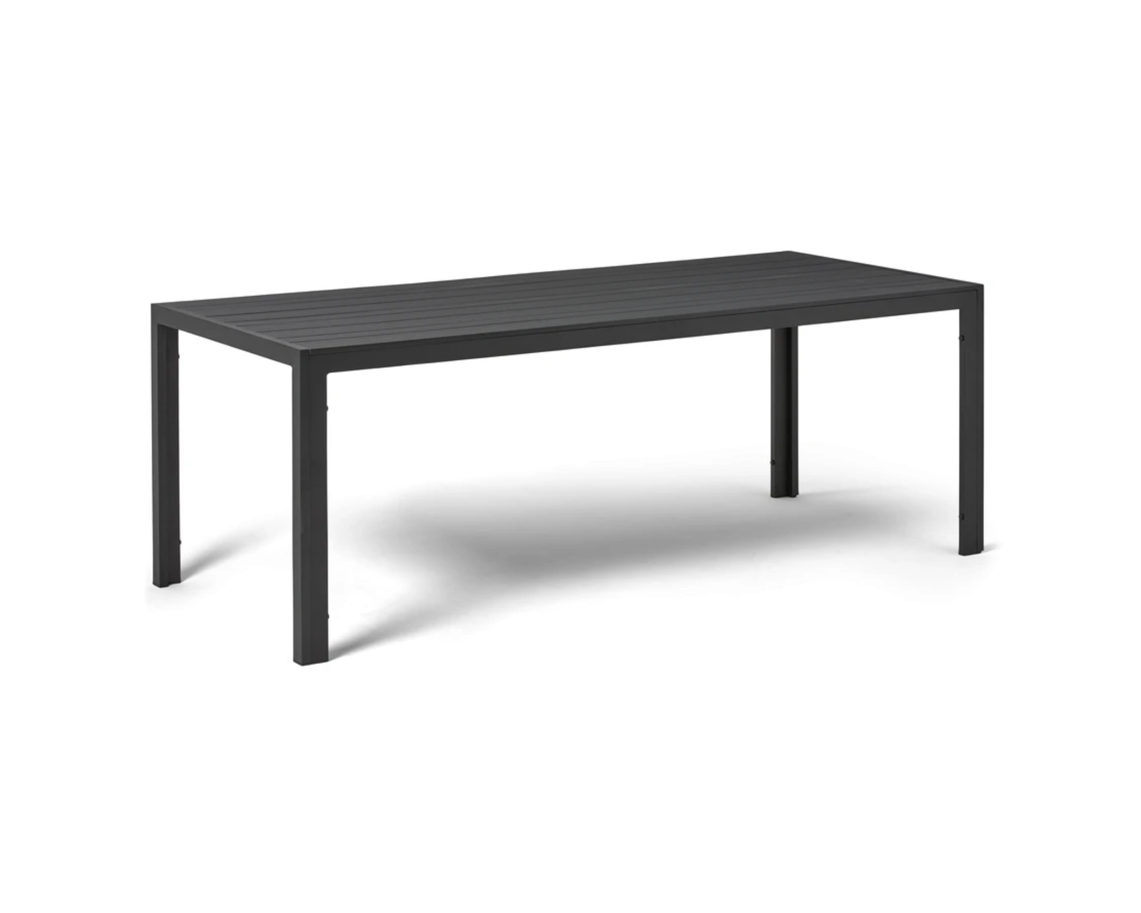 A stylish and easy to maintain outdoor table made of synthetic wood with a rust-proof aluminum frame. Några repor och bucklor, och en metalldel är något böjd.